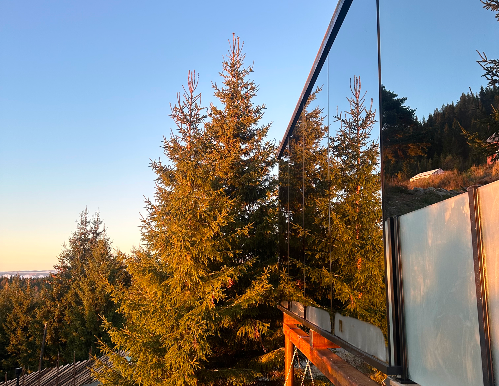 - Speilfasade i naturen: Hytta reflekterer landskapet rundt, og den speilbelagte fasaden gjør at hytta smelter inn i omgivelsene.