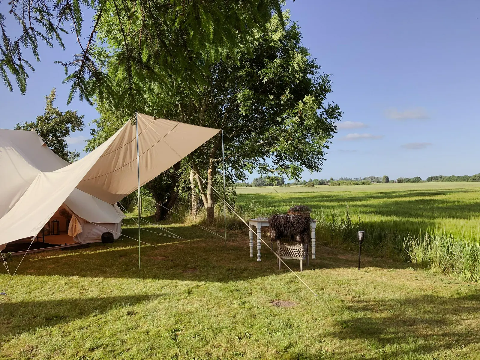 I har eget spisebord under solsejl ved teltet, men I har også mulighed for at nyde jeres mad på terrassen under parasollen. I kan finde ekstra tæpper, spil og bøger i teltet. Er der åbent i vores nye keramikværksted og i bryghuset er I velkomne til at kigge indenfor.