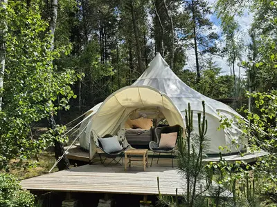 Velkommen til Schellerup Gård ❤️ Vores lille gård drives i dag af mig selv (Benjamin), min kone (Charlotte), vores to piger (Sif og Lily), og ej at glemme vores bamse-hund Sander. Sammen har vi skabt en lille oase midt i naturen – født ud af en passion og en drøm, vi har båret med os længe. En drøm om et sted, hvor tempoet må falde, skuldrene sænkes, og hvor der er plads til at være menneske. Nede på jorden og autentisk, som vi mener det bør være. Schellerup Gård er for os ikke bare et sted at overnatte. Det er et sted at trække vejret dybt igen. Et autentisk, nærværende og personligt get-away, hvor natur, ro og komfort går hånd i hånd. Her er der plads til romantiske ophold, rolige venindeture eller bare en tiltrængt pause fra hverdagen. Drømmer du om at vågne midt i naturens stilhed, omgivet af åbne marker og frisk landluft, så er du landet det rette sted. Her sænker skuldrene sig helt automatisk. Du træder ud af teltet til fuglesang og bløde horisonter, mens morgenen stille folder sig ud. Hver eneste detalje er nøje udvalgt for at give dig følelsen af luksus i det fri – hyggeligt, æstetisk og med masser af plads til bare at være. Når aftenen falder på, kan du nyde solnedgangen over landskabet, tænde op i hyggen og mærke stilheden sænke sig. Det er netop de øjeblikke, vi selv faldt for – og som vi ønsker at dele med jer. Gården har sin egen historie. Schellerup Gård blev oprindeligt bygget i 1910, hvor den bestod af en hovedbygning, en lade og 12 hektar landbrugsjord. I 1960 blev der opført en ekstra længe, og jorden blev omlagt til skovarealer. Vi overtog gården i efteråret 2021 med et stort ønske: at gøre Schellerup Gård til et fantastisk sted for os selv, vores børn, vores lokalsamfund – og ikke mindst for jer, vores gæster. Vi har mange planer for fremtiden, men driver gården videre i samme ånd og med dyb respekt for historien. For os handler Schellerup Gård om gårdidyl og magi. Og vi glæder os til at byde dig velkommen ✨