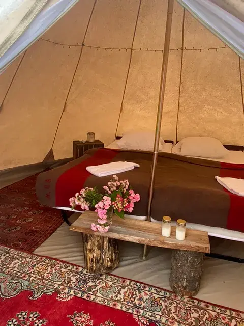 Naturlig Glamping hos KorsgaardenNaturlig Glamping hos Korsgaarden er placeret blot 1,5 time fra København, her har du muligheden for at slappe af og sænke skuldrene sammen med din familie, din kæreste eller dine venner. Den hyggelige tipi Skallen (glamping telt) er en unik overnatning i den skønne natur ved Korsgaarden. Priserne for 2 personer per overnatning er inklusiv morgenmad. Øvrige måltider står man selv for, men vi har naturligvis masser af redskaber, så du nemt kan lave lækkerier på bål. Morgenmaden består af kaffe, te, juice, yoghurt med knas, surdejsbolle med ost. Korsgaarden er en oase i sig selv, med vidtstrakte naturområder, hvor alle kan strejfe frit og børnene forsvinde ind i eventyr og leg. Check-ind: mellem 15 og 21 Send en SMS, så kan vi tage godt imod jer. Extra tilkøb: Medbring hund 300,- Sauna per pers 135,- Cykel per dag 300,- Paddleboard per time 150,- Mega paddleboard (6 personer) per time 250,- Fisketilladelse 150,- Lej en fiskestang 100,- Robåd pertime 150,-