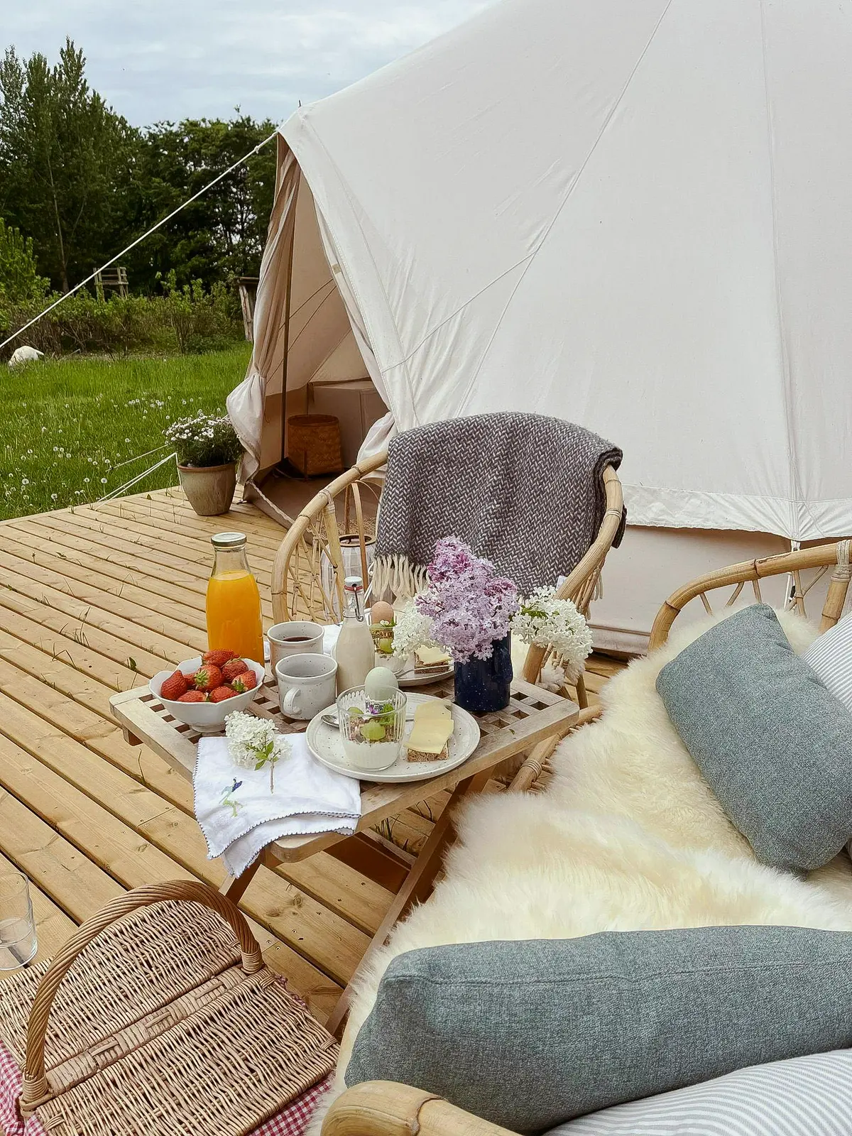 Du finder det hyggelig indrettet teltet bagerst på vores 6500 kvm store grund, mellem æbletræerne og brombærkrattet. Haven deles med en mindre gruppe hjorte, der dagligt kommer forbi - der er sikkert dem i kan høre gnaske græs, når i går til ro i teltet.