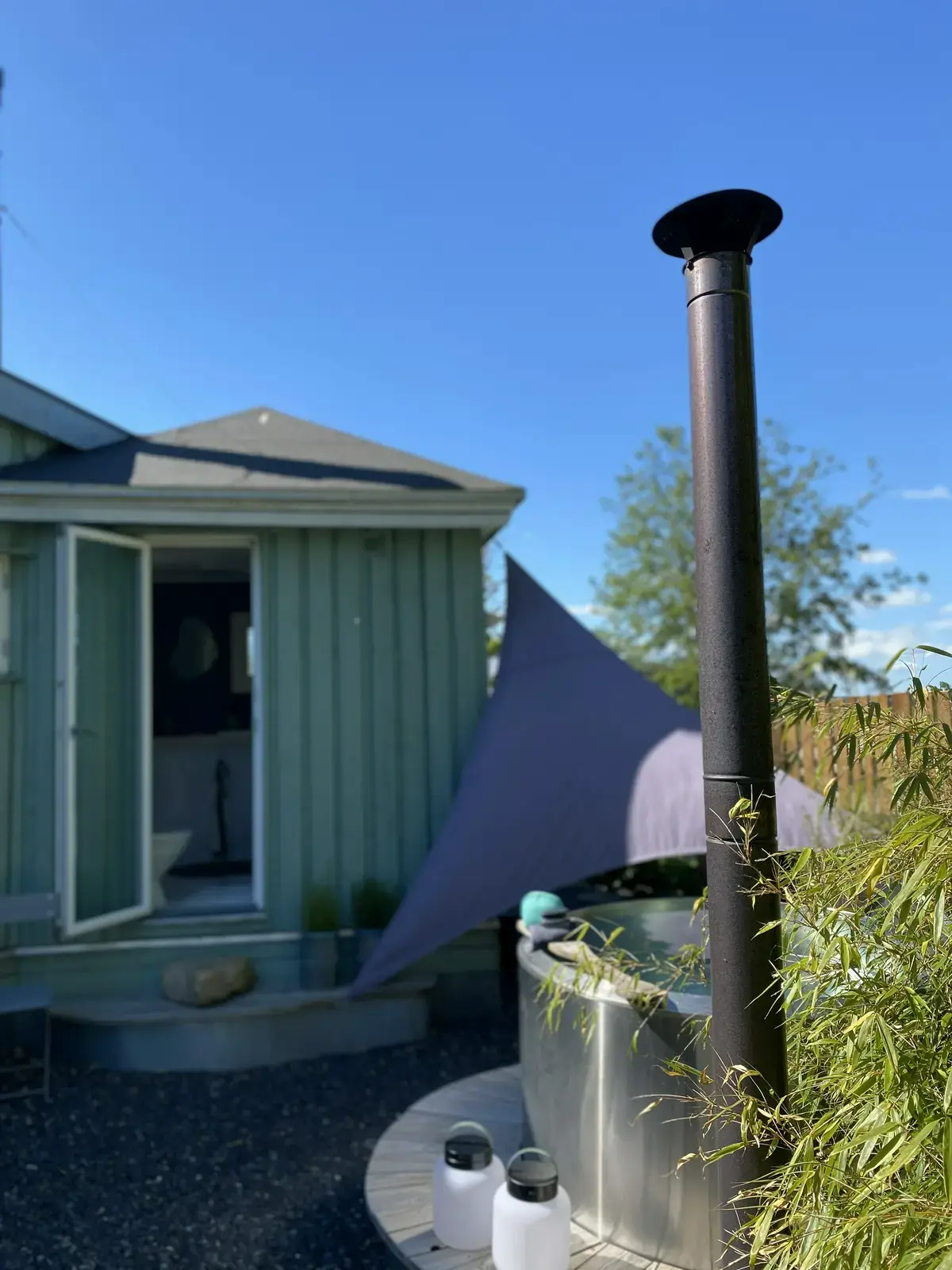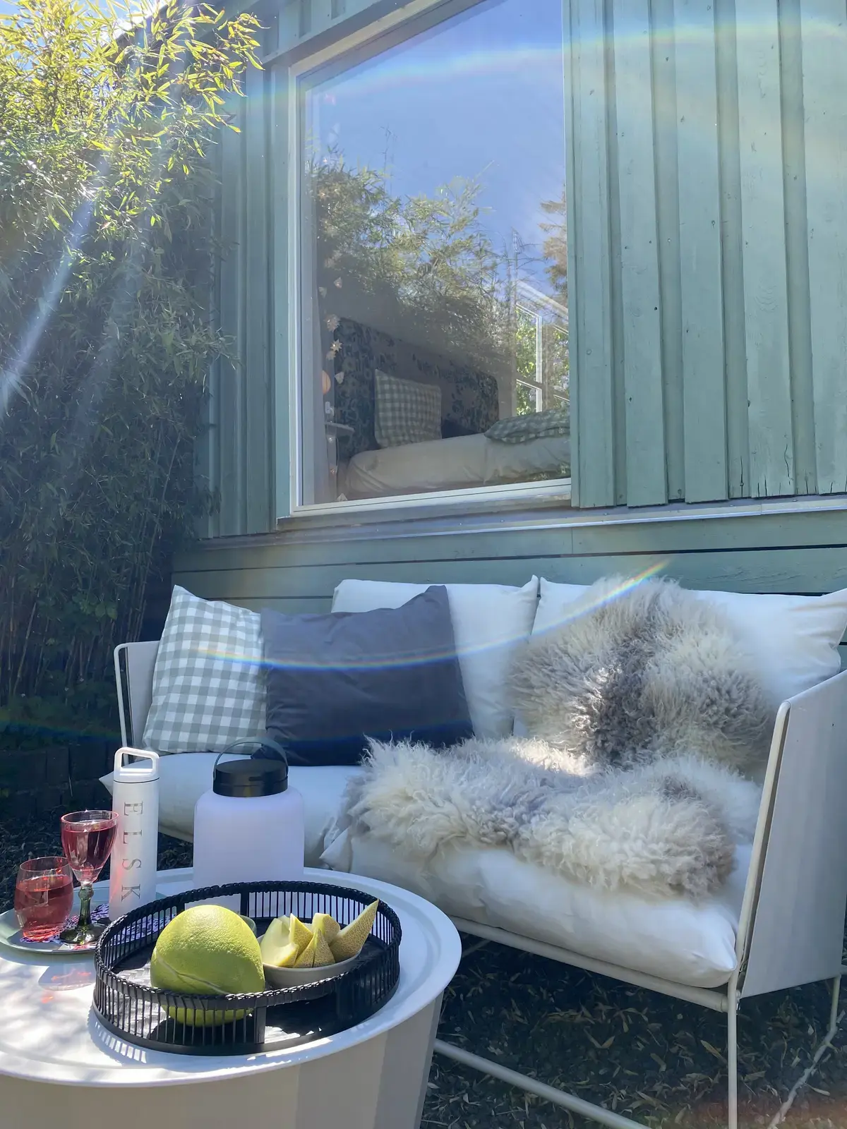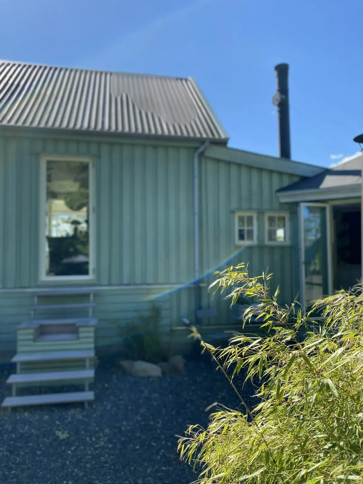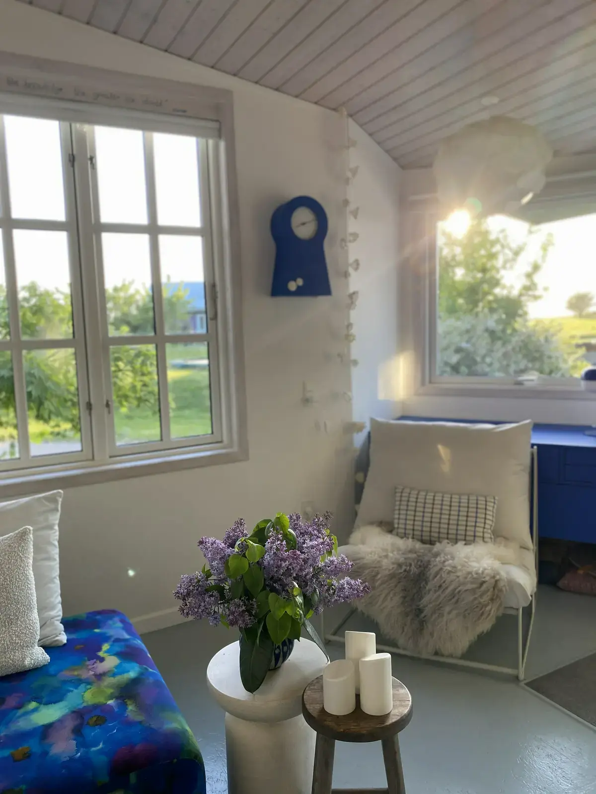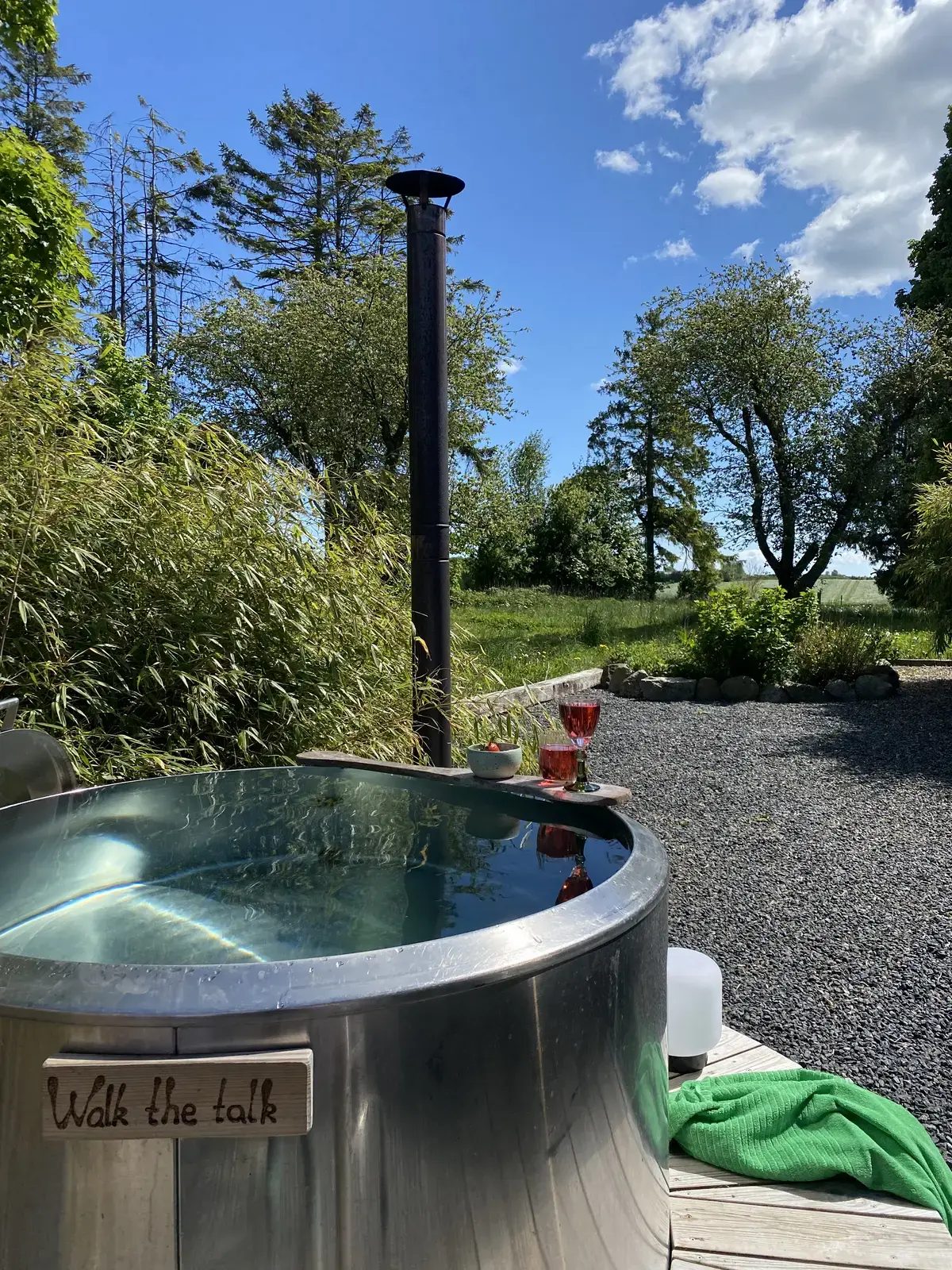 Her er en kreativ perle med masser af detaljer. Brændefyret udebad på 600l med plads til 2 personer. Hyggelig bålplads, med udsigt til hytten, haven. Her emmer af grønne omgivelser, himmel og horisont. Dejlig dobbeltseng på 160x200cm med udsigt gennem dejlig stort vinduesparti. Der vil stå morgenmad klar i køleskabet, som består af 2 surdejsboller med smør, ost og syltetøj til .. skyr el. yoghurt med drys .. 2 æg der skal koges og 2 x appelsinjuice. Der er isterninger i fryseren 🧊🍸☀️💚