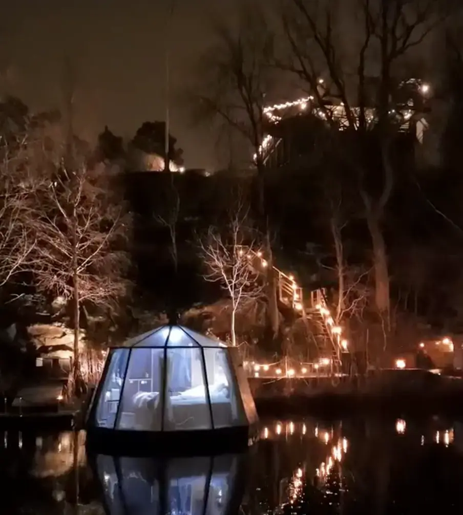 Velkommen til Oasen Lakehouse Retreat! – din private oase ved Öringesjön, beliggende i Tyresö Strands fortryllende natur. Når du kommer ned til søen, venter din egen oase med vores populære skovspa og iglo i grønne omgivelser. Vores ForestSpa er nu åben, og du kan bruge den dejlige udendørsbruser eller hoppe i den opvarmede jacuzzi, mens du kigger ud over søen. Bemærk venligst, at jacuzzi og udendørsbruser lukker for sæsonen den 17. november og genåbner den 1. maj, medmindre andet er meddelt. Når aftenen kommer, og lysene tændes, er et saunabad en fantastisk måde at slappe af og nyde roen på. Medbring din egen mad til os, og tilbered den i det lille udendørskøkken med kulgrill og bærbar induktionskogeplade. Slap af på en af liggestolene, eller tag en tur på søen med robåden, måske til stranden, som ligger 15 minutter væk? For de aktive er der 2 SUP-boards (stand-up paddleboards) til rådighed. Slap af i igloen året rundt og lad dig rive med af den storslåede 180 graders panoramaudsigt over søen fra de store vinduer i loftet og på væggene. Bag et lille forhæng er der et toilet (separat), og ved siden af sengen, som er 140 cm, er der et lille tekøkken med bestik/tallerkener/glas/gryder osv. Der er rindende vand i begrænsede mængder tilgængeligt i båden, men vi anbefaler ikke at drikke det. Varmt vand er tilgængeligt i den udendørs bruser. Efterårs- og vintersæsonen er der gode chancer for at se nordlys! Fra flydebroen, mens du nipper til din morgenkaffe eller nyder en stjerneklar nat, kan du måske endda se nordlys. Lad din sjæl og dit sind hvile i disse idylliske omgivelser, måske møder du nogle af de dyr, der bor ved siden af dig, bæveren, ræven, hjorten og rådyret! Vi har tænkt på alt for at gøre dit ophold så behageligt som muligt. Fra sengelinned til håndklæder, badekåber til Nespresso-kaffe, er hver eneste detalje omhyggeligt udvalgt for at skabe en ægte følelse af hjem. Alt du skal gøre er at pakke dine yndlingsretter og personlige ejendele – vi tager os af resten, og på nogle dage kan vi også tilbyde vores populære morgenmadskurv og charcuteri-tallerken som ekstraudstyr. Bookes og betales inden ankomst. En varm velkomst til et virkelig afslappende og uforglemmeligt ophold!