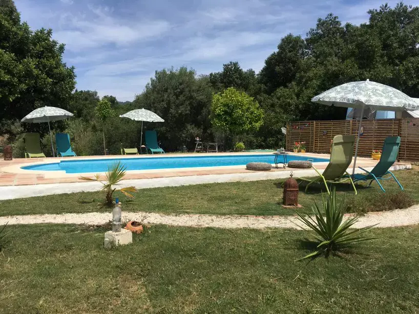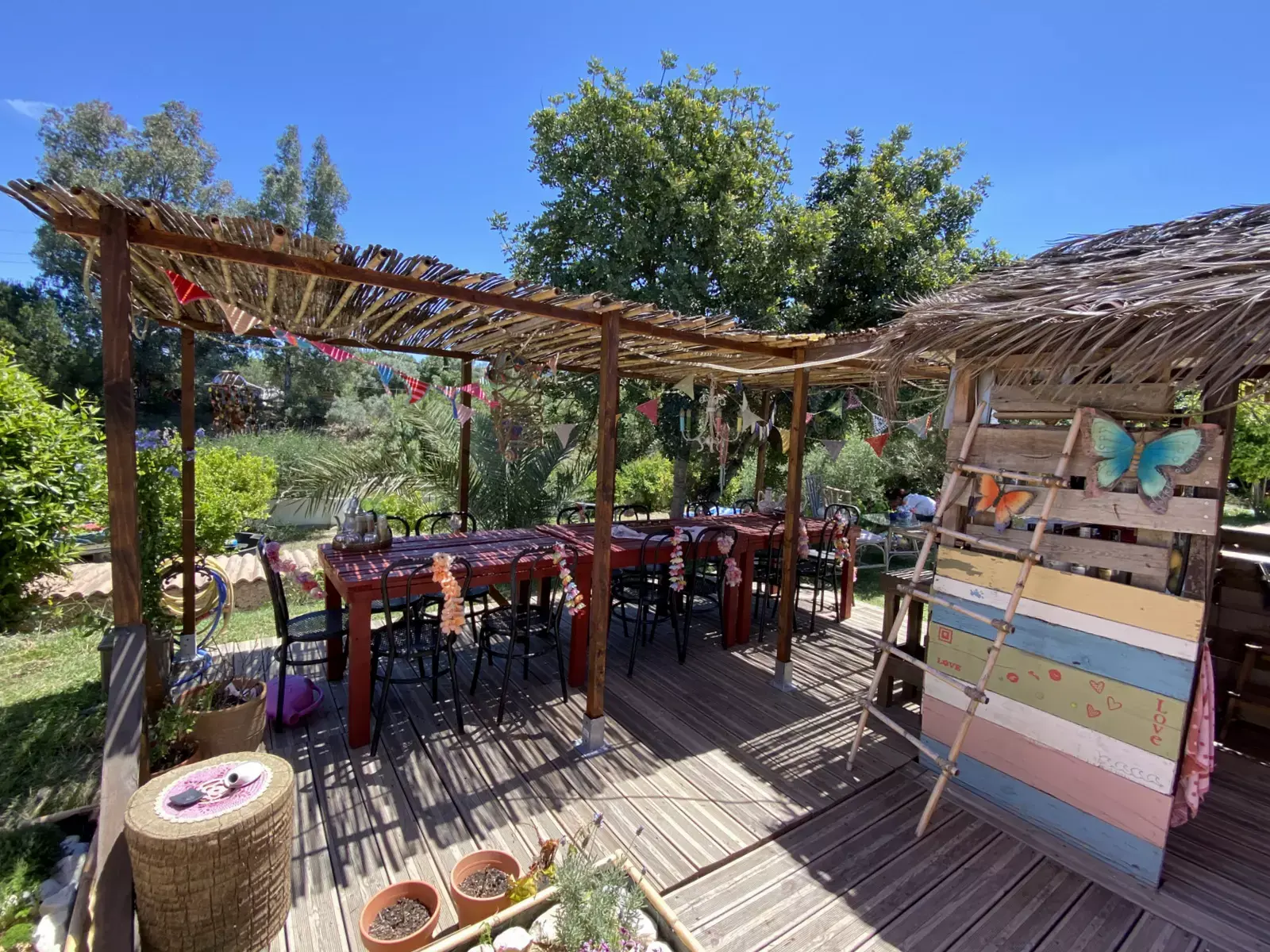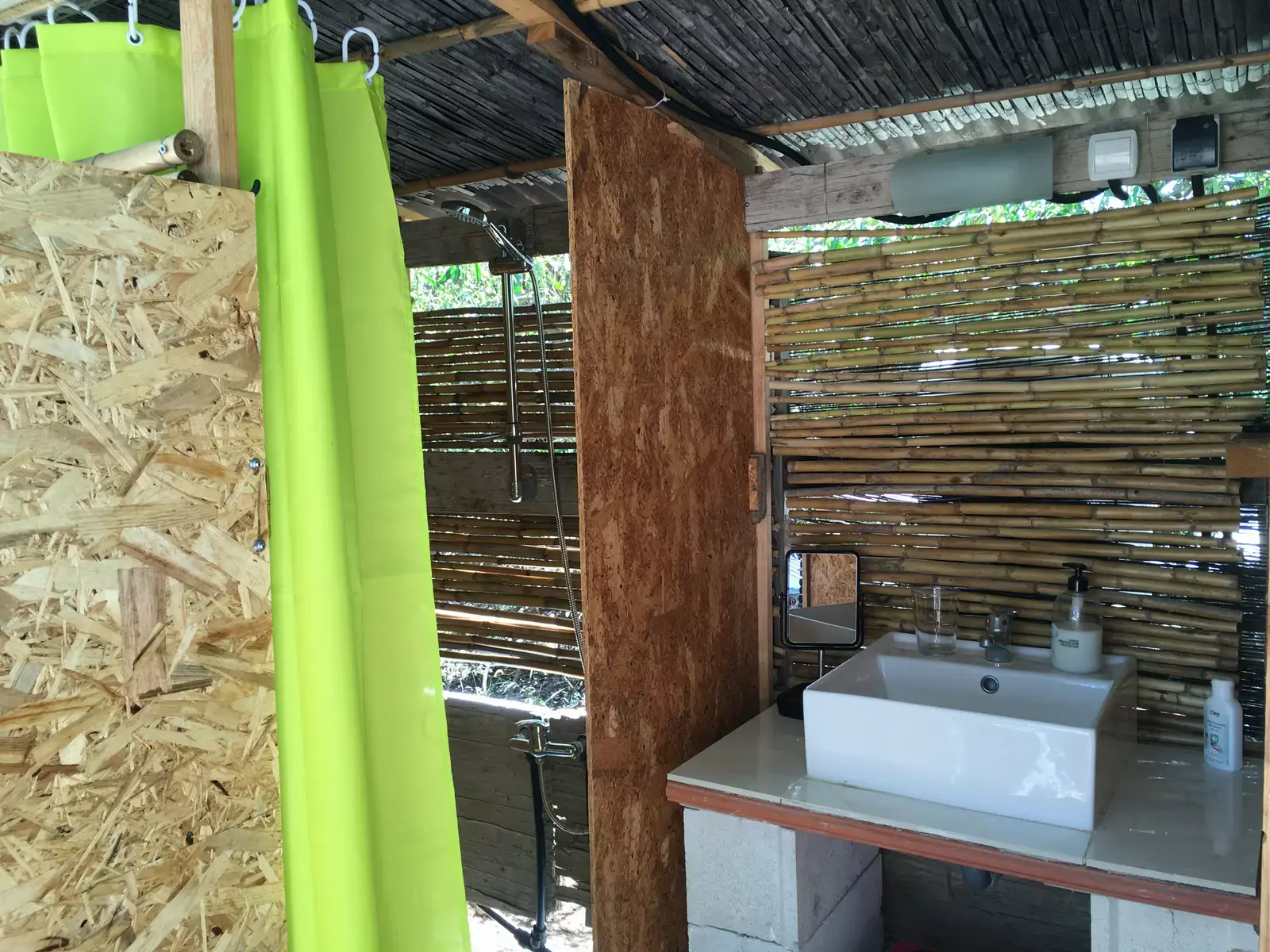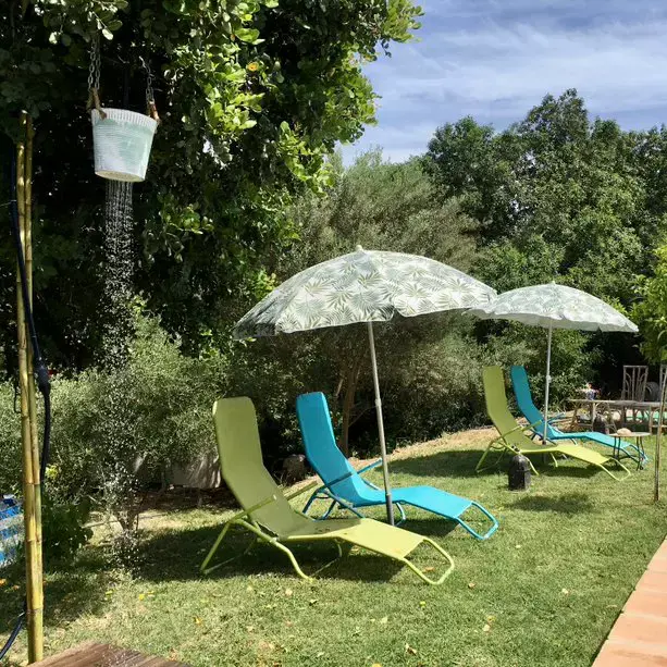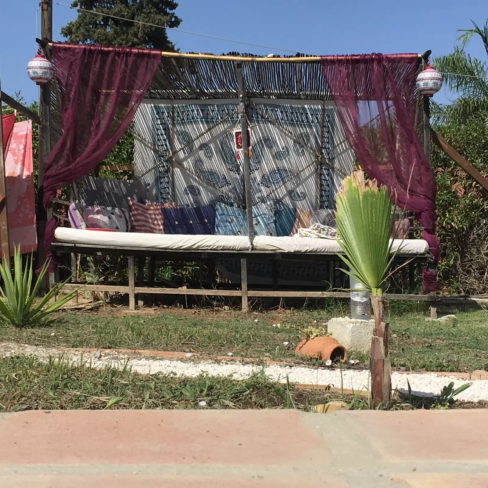 Unter einem großen alten Olivenbaum, versteckt in einer Ecke mit viel Privatsphäre, finden Sie unser Glockenzelt Jungle. Das Innere des Rundzeltes mit einem Durchmesser von 5m ist mit Ranken, tropischen Blättern und vielen wilden (und kuscheligen) Tieren geschmückt. In der Mitte befindet sich ein Kingsize-Bett, an den Seiten können bis zu zwei Einzelbetten aufgestellt werden. Für die wärmeren Nächte ist ein Ventilator vorgesehen, die Belüftung im Zelt ist optimal durch Moskitonetze, die alle Fenster und Türen abdecken, und Belüftungsöffnungen im Dach des Zeltes, die die warme Tagesluft leicht entweichen lassen. Außerhalb des Zeltes finden Sie die voll ausgestattete Außenküche mit fließendem Wasser, einem Kühlschrank und 2 Gasherden. Neben der Küche befindet sich ein großer Tisch mit vier Stühlen, an dem Sie Ihre zubereiteten Mahlzeiten genießen können. Zwischen 2 Olivenbäumen befindet sich eine Hängematte und hinter dem Zelt befindet sich eine versteckte Sitzecke. Die Gemeinschaftsbäder befinden sich in unmittelbarer Nähe.