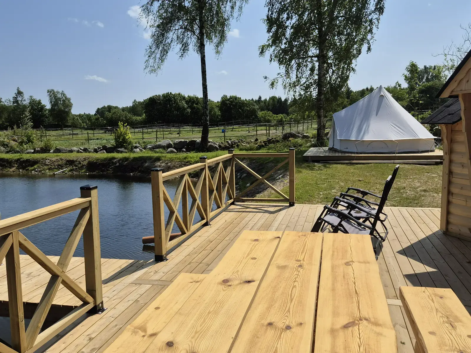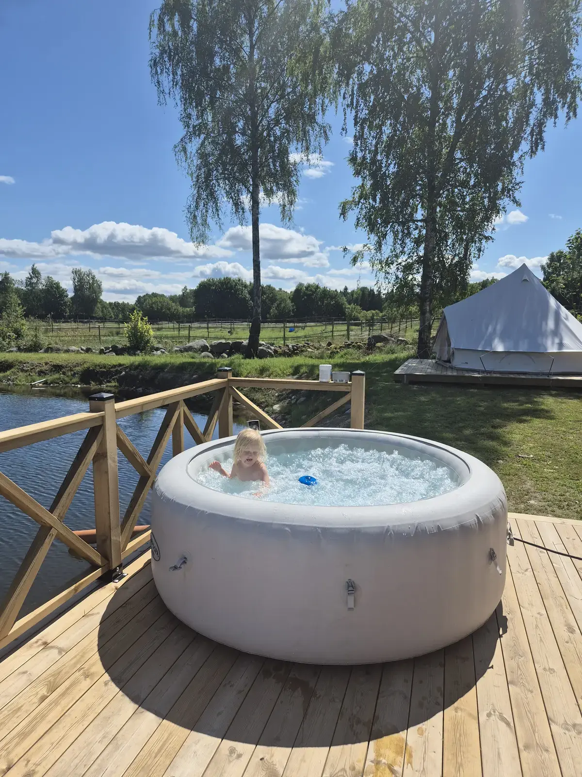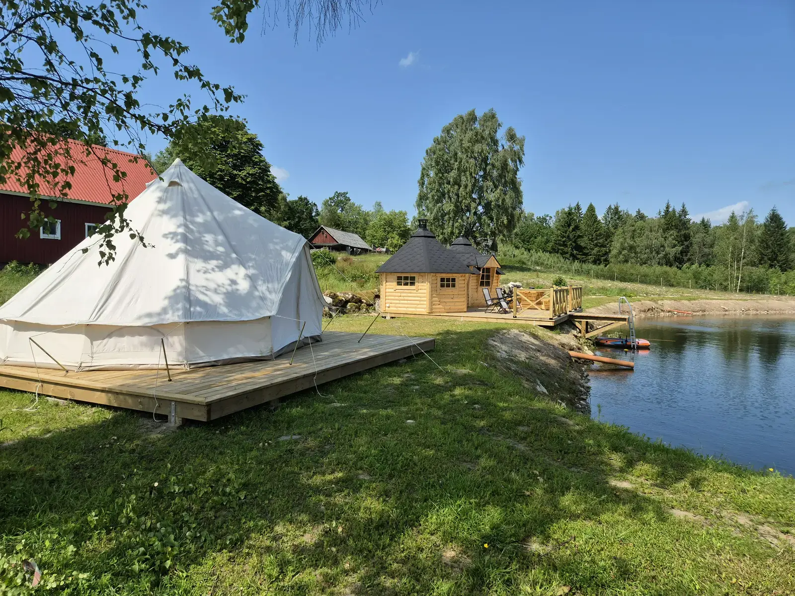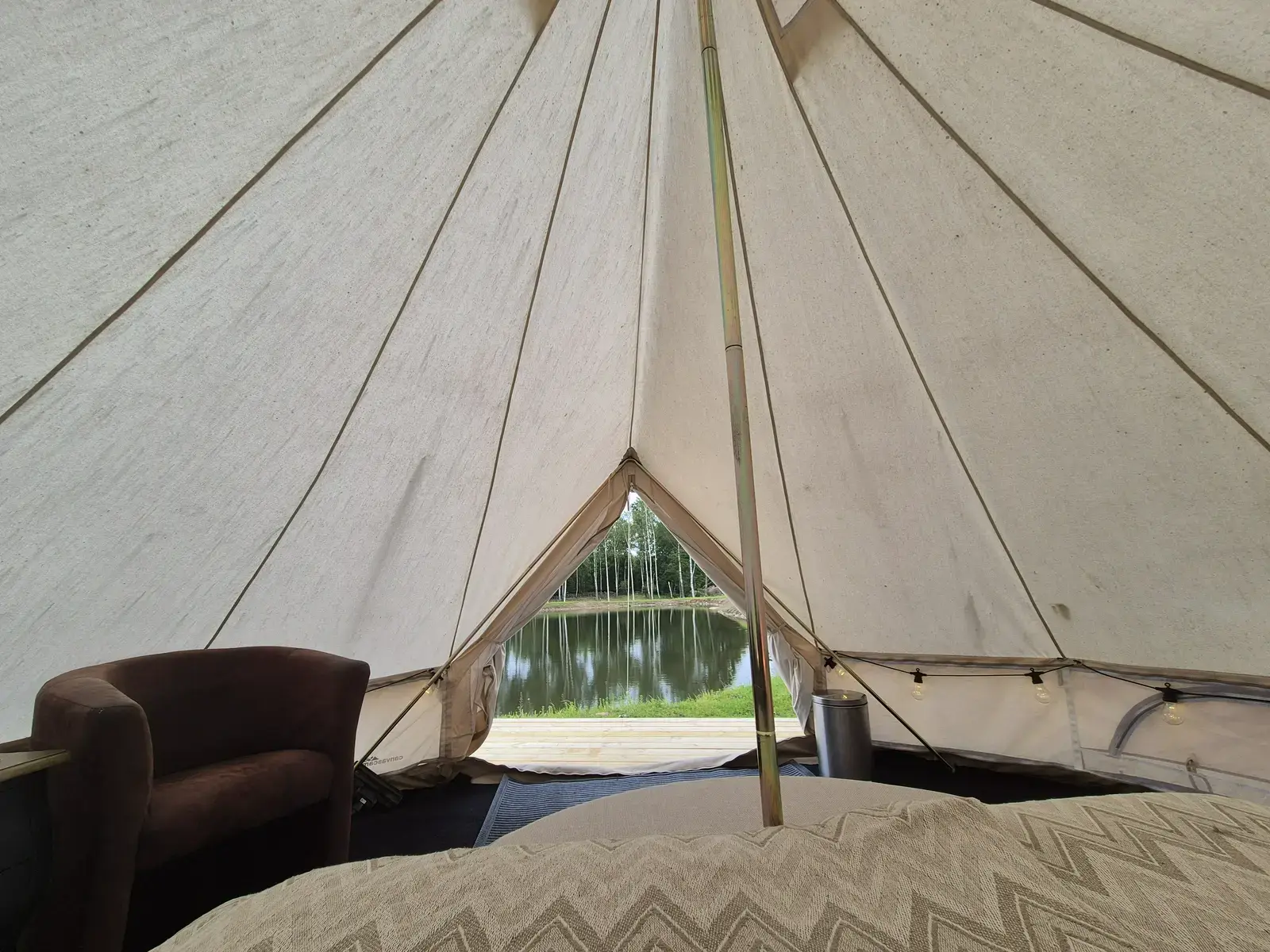 Das Zelt liegt direkt an einem kleinen See. Neben einer Saunakabine und einer Grillhütte gibt es auch einen Whirlpool mit Steg und Badebereich. 30 Meter entfernt befindet sich ein komplett neu gebautes Badezimmer. Das Zelt verfügt außerdem über Strom.
