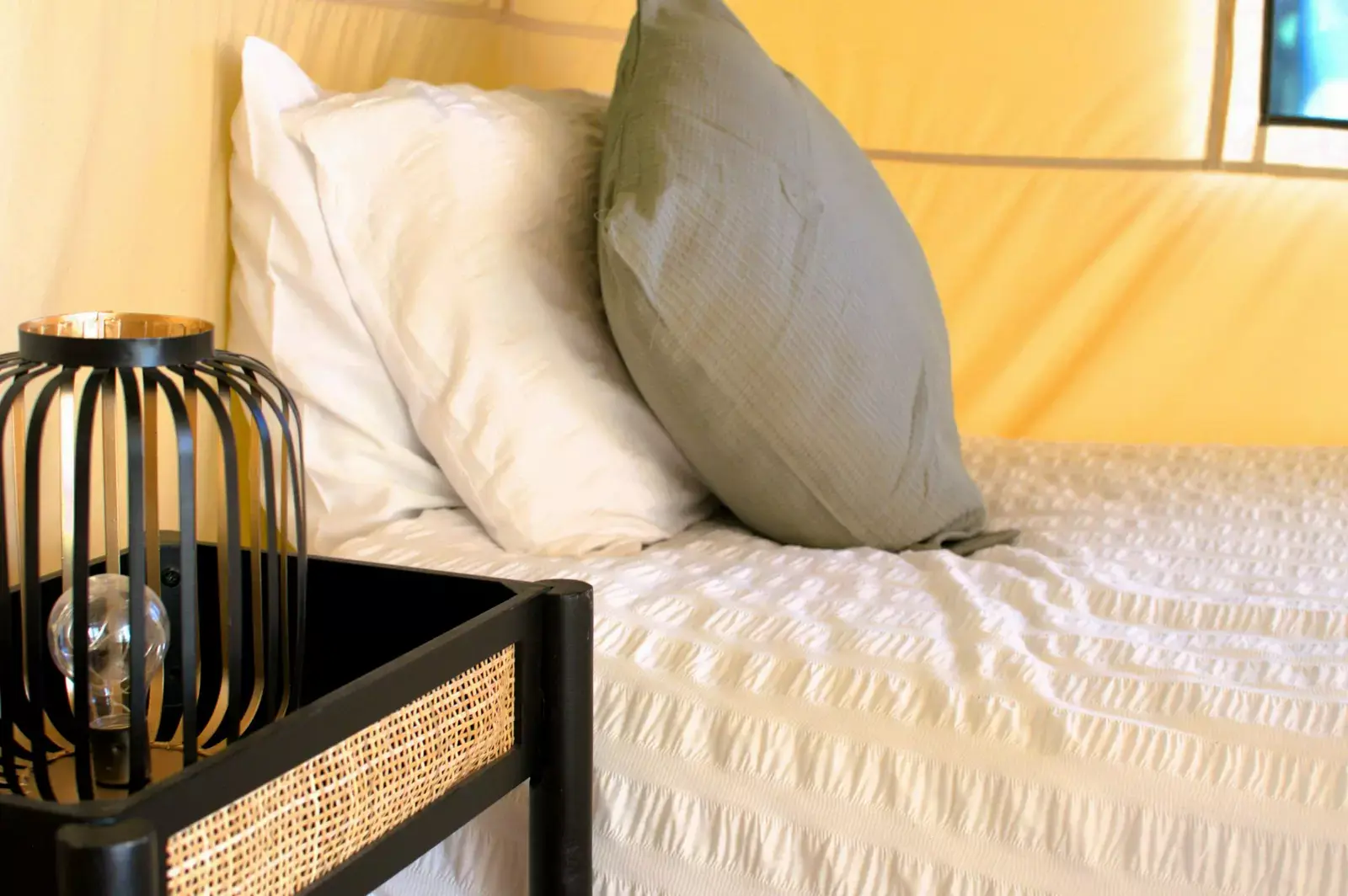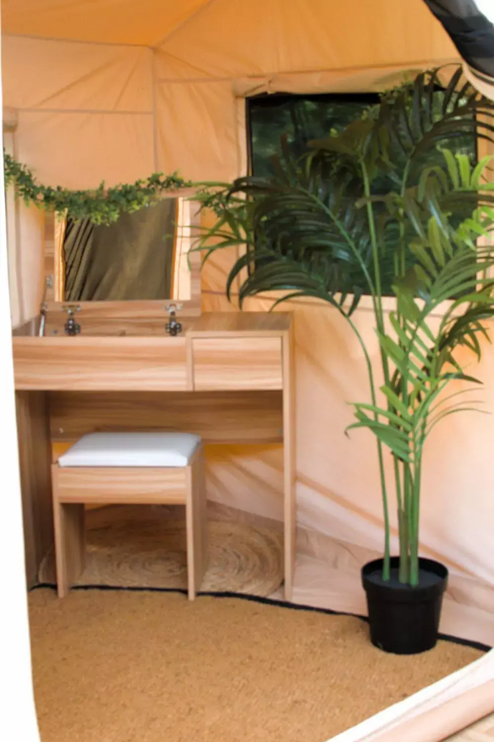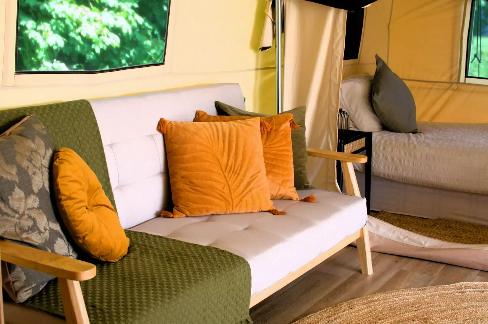 Dieses luxuriöse Lodgezelt ist ideal für Familien und kleinere Gruppen. Dieses wunderschön eingerichtete Zelt ist bei Ihrer Ankunft aufgebaut und bereit und umfasst drei Schlafzimmerabteile und einen allgemeinen Wohnbereich. Der allgemeine Wohnbereich verfügt über ein kleines Sofa. Das Hauptschlafzimmerabteil verfügt über ein Doppelbett, während die beiden kleineren Abteile über ein Einzelbett verfügen. Dieses Lodgezelt ist komplett mit Strom ausgestattet, sodass Sie alle Ihre Lieblingsgeräte betreiben und aufladen können.