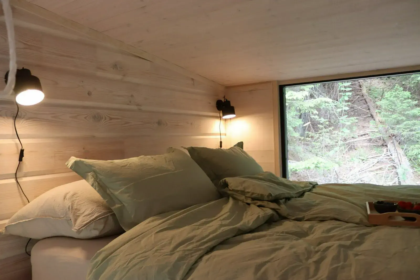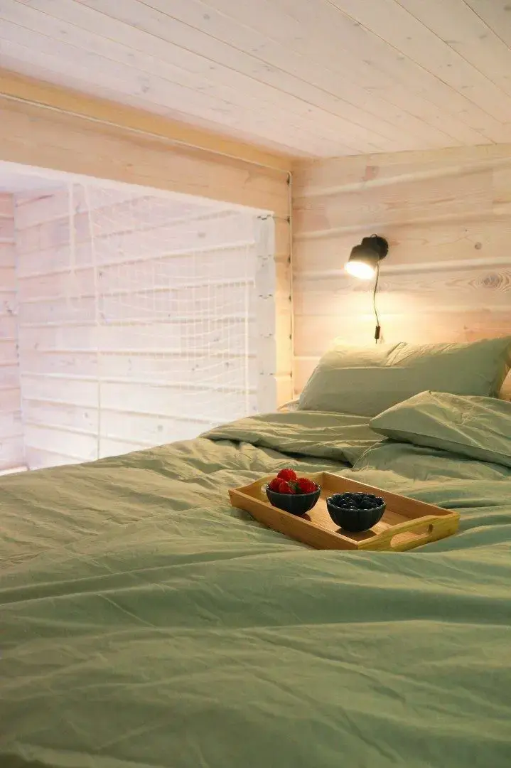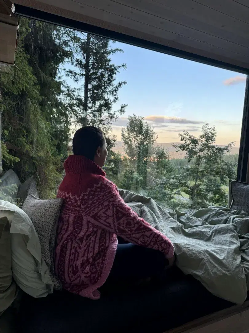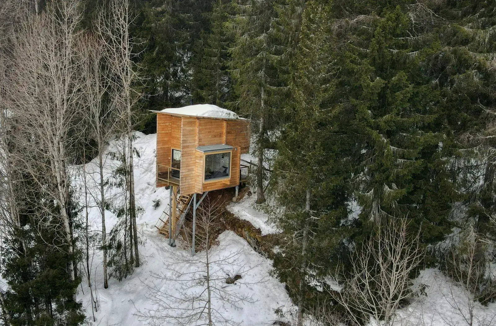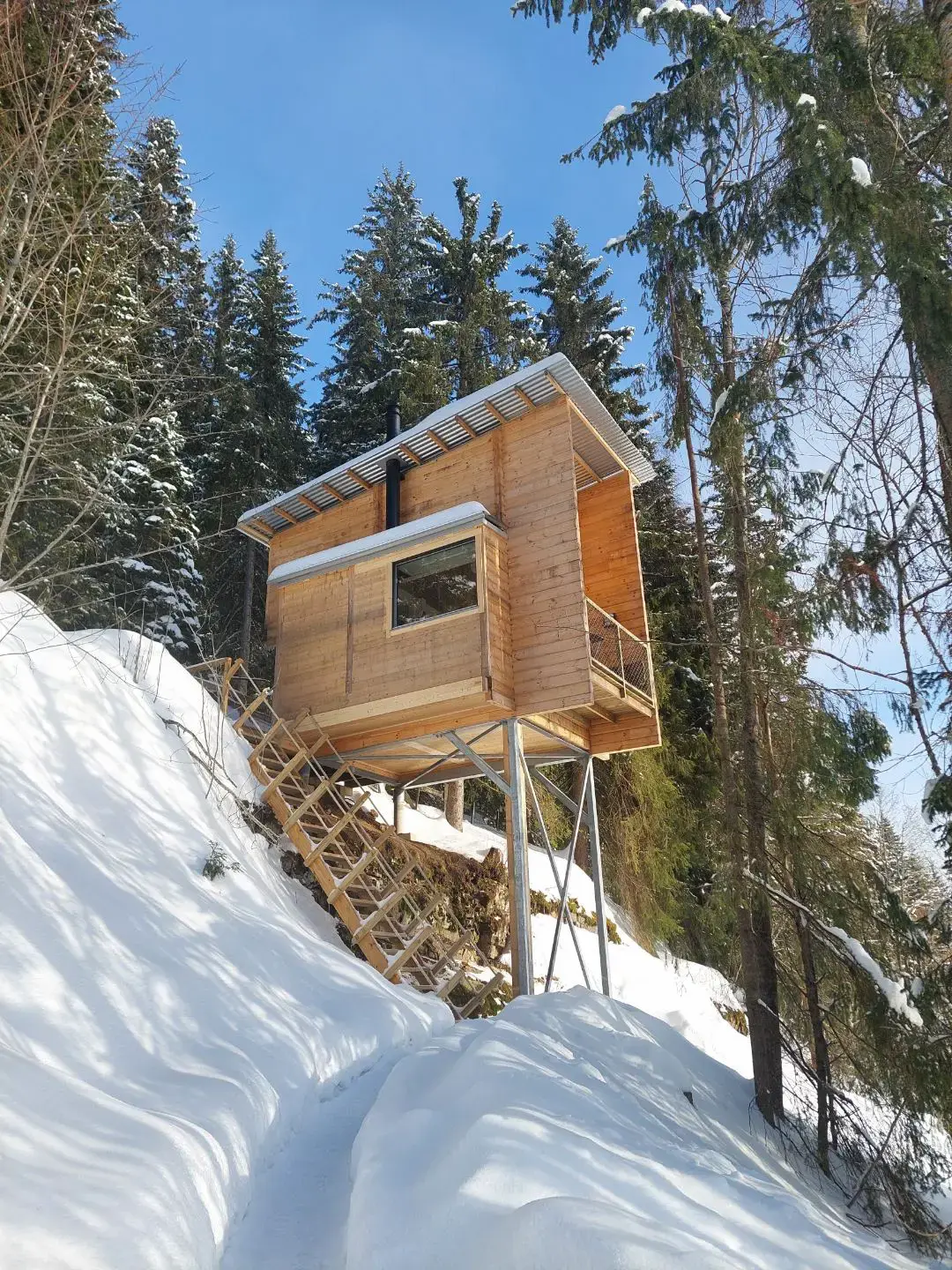"WHAT a place! Perfect for a day of total relaxation and low shoulders. The treetop cabin was cozy and well equipped. We had a GREAT time!" "What a fantastic experience! I have been to several treetop cabins before and I must say that this one was 10/10! Beautiful surroundings and a really great cabin that has all the amenities you need." (Google reviews) This treetop cabin sleeps four. The cabin has a bathroom with heating cables, shower and wc. The living room contains a fully equipped kitchen with fridge, stove and wood stove. There is also a dining tableand a bench that can be pulled out for a double bed. There is room for four people on the veranda. Perfect for enjoying your morning coffee. From the car park it is approx. 300 meters to walk to the cabin. The first 200 meters are up a dirt road, before you walk the last 100 meters above ground. In winter, it is possible to go skiing, snowshoeing or on foot. Enjoy the beautiful nature, feel the fresh air, and feel the good feeling of entering the unique treetop cabin Knausen. Snowshoes for loan hang outside the cabin. If you wish to borrow snowshoes from the car park, the number and gender/size must be stated in the order or sent by email.