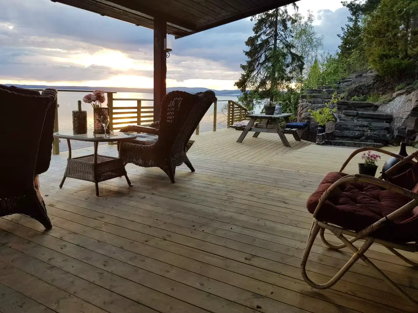 The cabin is equipped with a large wooden terrace, perfect for meals under the open sky or cozy evenings when the weather changes. Part of the terrace is covered, allowing you to enjoy the view even when the weather is less cooperative. The furnishings consist of a dining table group and a wicker seating area, as well as comfortable lounge chairs where you can easily let the hours fly by.