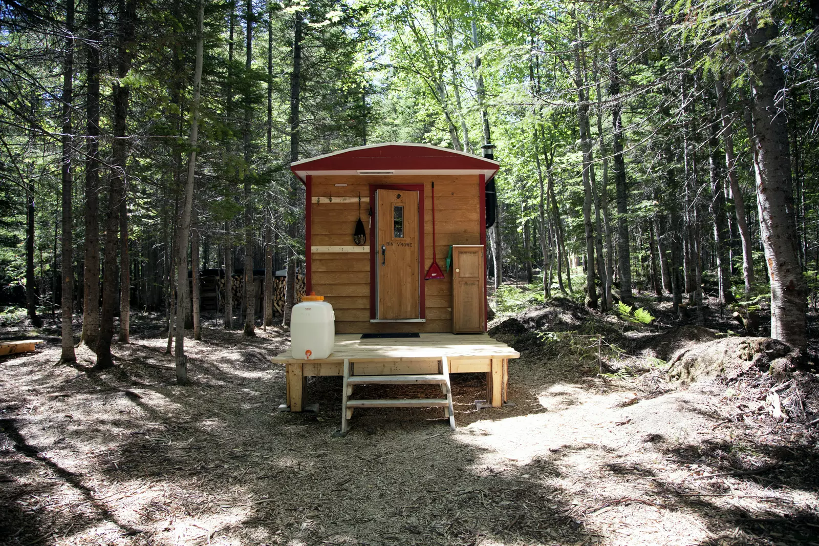 Ancien camp de chasse réaménagé en Micro-Maison pacifique de 12 m2, hors réseau (pas d’électricité, pas d’internet), avec terrasse de 8 m2, située au calme en forêt.