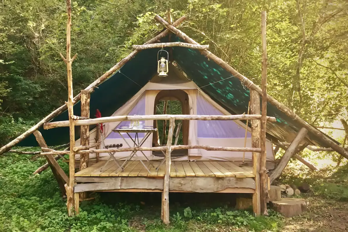 La tente-tipi se trouve sur le terrain de nos deux granges de montagne au cœur du parc régional des Pyrénées ariégeoises. Vous y trouverez la sensation d’un véritable bivouac nature nommé Triptrappeur : une initiation à la vie de camp autonome (sans réseau électrique ni eau de ville). En alliant confort et retour au sources nous vous accueillons en couple, en famille ou entre amis pour un weekend, un séjour, une étape sur la route des sentiers de randonnées de montagne.