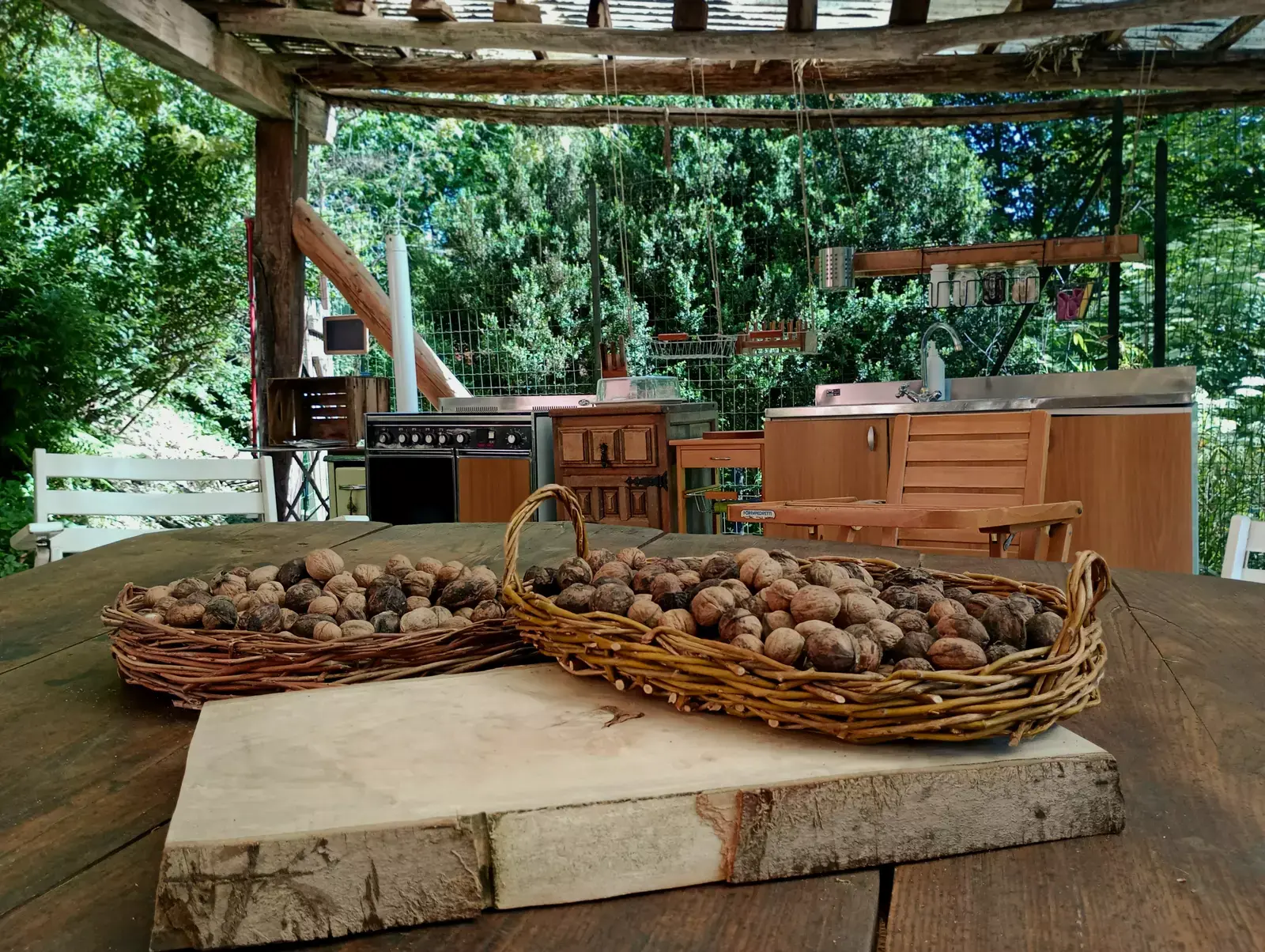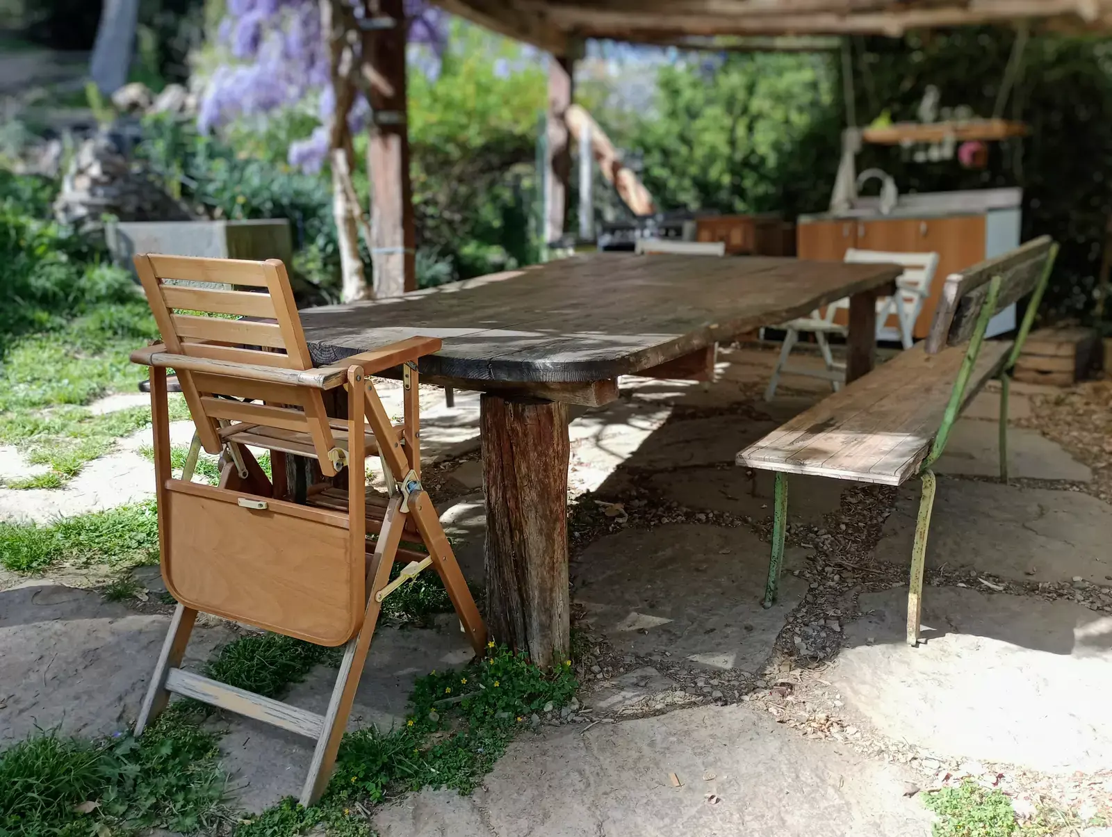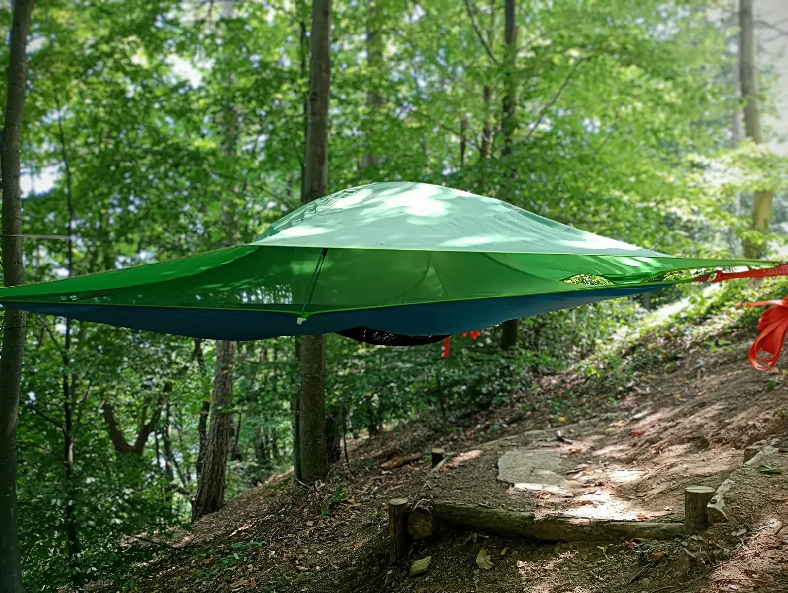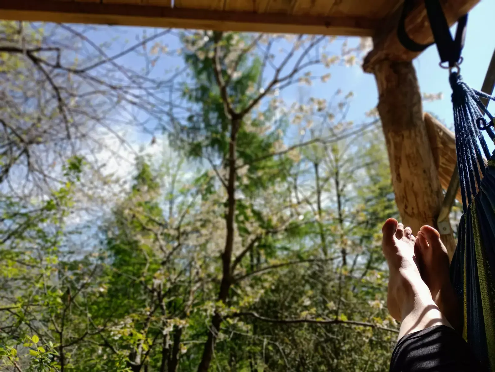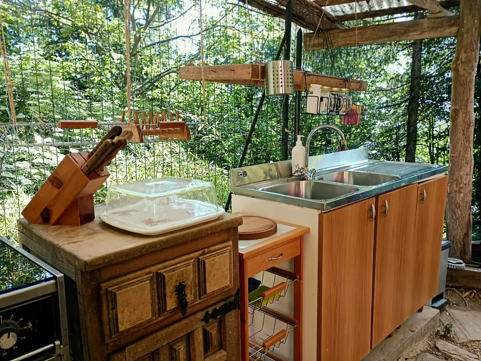 Tienda de árbol: La cama es una hamaca de doble tensión suspendida entre los árboles. Cuenta con una correa divisoria ajustable en el centro que transforma el suelo en una o dos camas. Está equipada con mosquitero y protector impermeable contra la lluvia. Será divertido para los niños y una experiencia inolvidable para los adultos. No se proporcionan sacos de dormir. Hay una habitación interior disponible para guardar el equipaje. El baño es un inodoro de compost cómodo y limpio que trata los desechos sólidos humanos mediante procesos de compostaje y deshidratación, obteniendo un producto final que puede utilizarse como mejorador orgánico del suelo en la agricultura. El agua de la ducha se calienta con paneles solares y está a su disposición. La cocina está al aire libre, pero resguardada, equipada con estufa y fregadero, vajilla y todo lo necesario para cocinar. Disfrute de sus comidas en la gran mesa de madera en el centro del mirador. Aquí encontrará electricidad, agua potable, un enchufe y un refrigerador. Habrá hamacas para relajarse y juegos entre los árboles para el disfrute de adultos y niños (trampolín, tirolesa, circuitos de equilibrio). Traiga su propio saco de dormir. Tenemos dos perros, dos gatos y algunas gallinas muy felices; no podemos alojar mascotas.