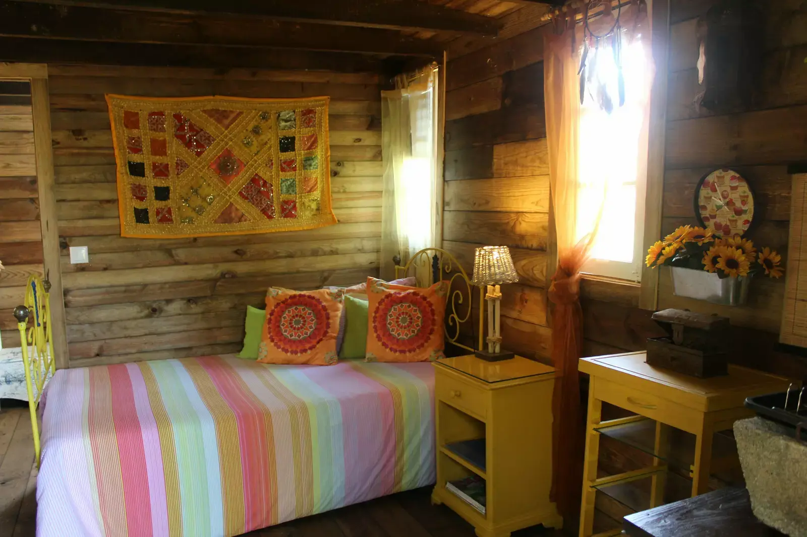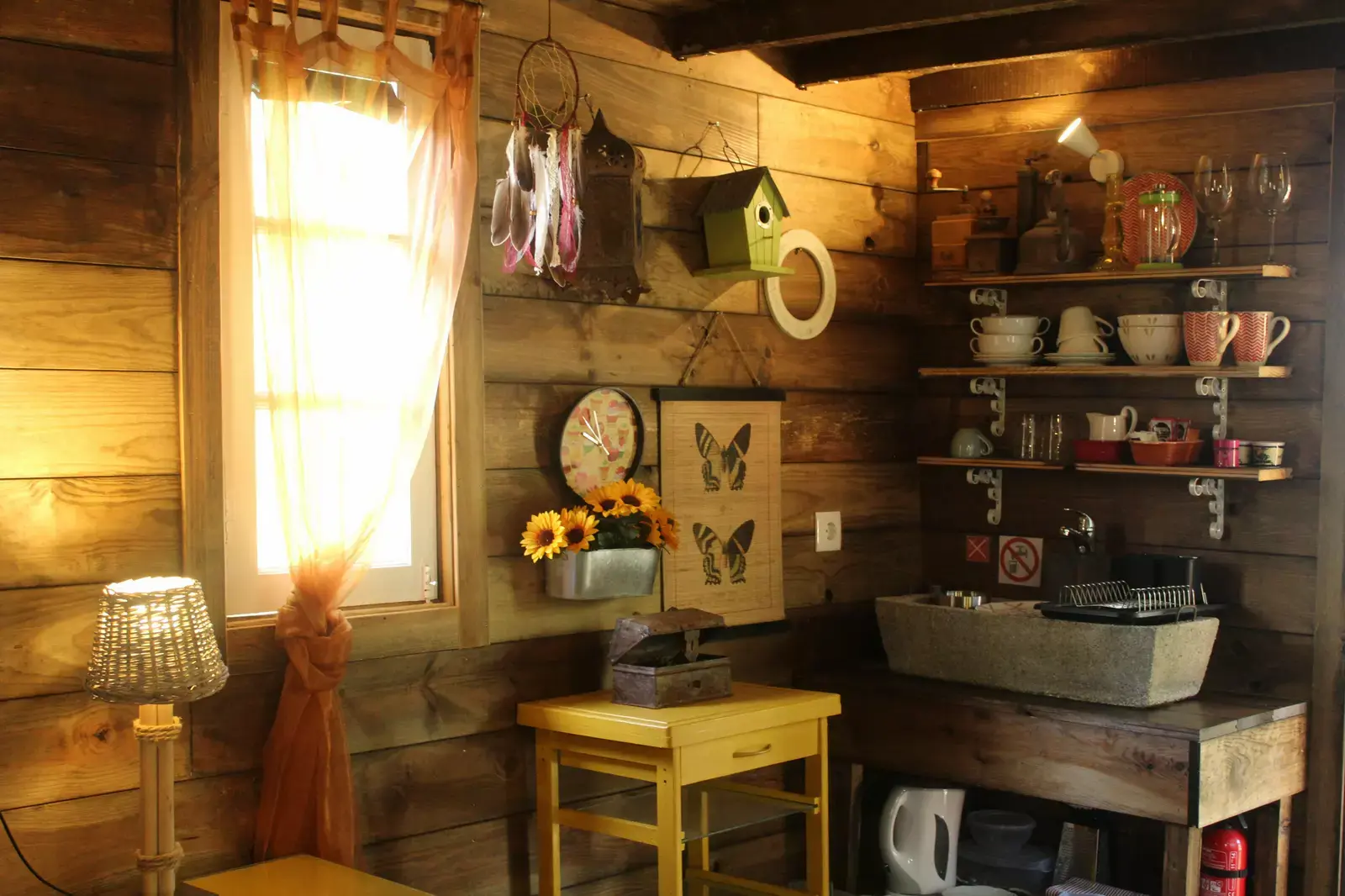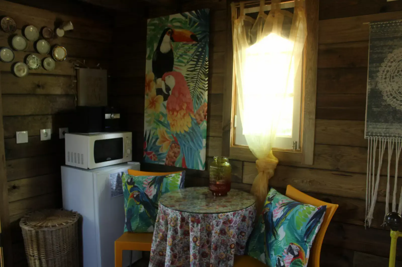 Hasta 2 personas Situada en medio de la finca, al lado de los animales. Características: Ropa de cama y aseo Productos de higiene (papel higiénico, champú, gel de ducha y acondicionador para el cabello) Calefacción por calentador Refrigerador Pava Microonda Utensilios de cocina Estufa eléctrica pequeña para cocinar comidas pequeñas Estacionamiento privado Radio y reproductor de CD Acceso al restaurante Acceso a la sala de juegos (juegos de mesa, ping pong y futbolín) Tina al aire libre No v No wifi Puntos de reciclaje cercanos