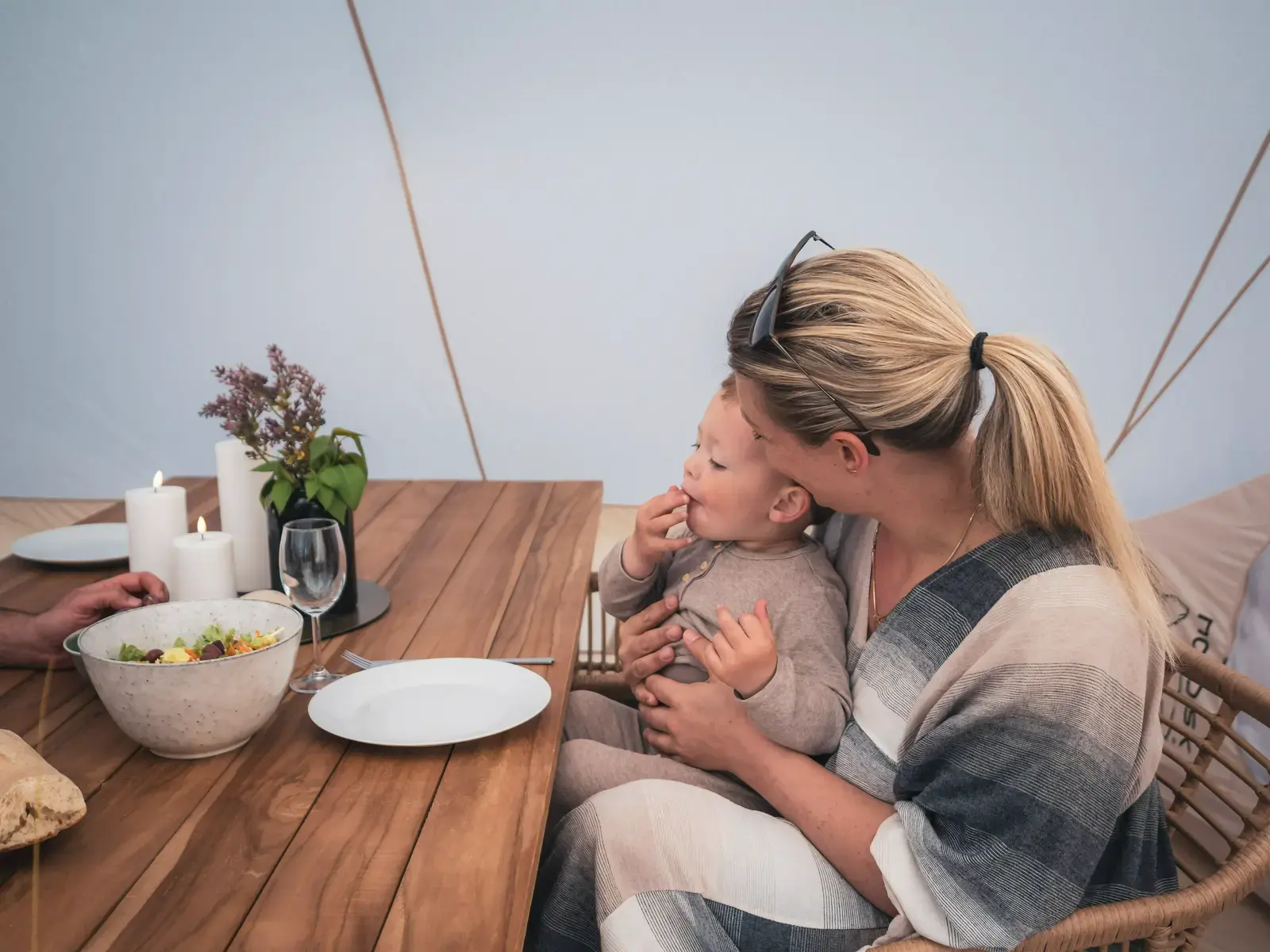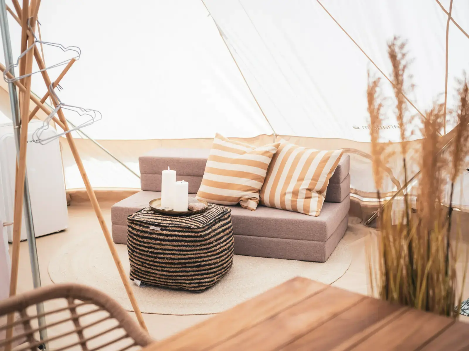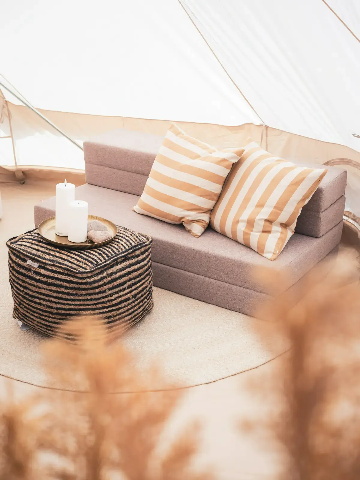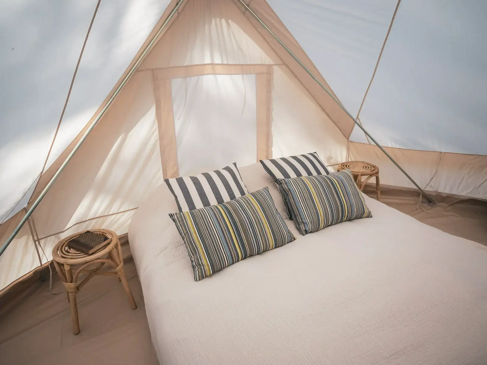 Profitez de quelques jours, sous les chênes, les pieds sur terre, dans un camping (pittoresque) pas tout à fait comme les autres. Situé dans la belle Faldsled avec plage, forêt, restaurant gastronomique de renommée internationale et pure idylle, vous pourrez profiter de baignades fraîches le matin dans la baie d'Helnæs, cuisiner au feu de camp, profiter de la piscine ou des nombreuses expériences gastronomiques du sud de la Fionie à proximité. Si vous aimez le plein air, mais que vous aimez aussi un peu de luxe supplémentaire, alors un séjour dans les spacieuses Tent Suites n'est probablement pas complètement hors de question - ici, vous obtenez une tente en coton respirante et confortable de 40 m2 entièrement meublée, décorée avec amour et design scandinave, comprenant un lit double, une grande table à manger avec des chaises, un coin salon (qui peut également être transformé en coin nuit pour 2 personnes), un espace de rangement, de l'électricité/des prises, des lumières, un réfrigérateur, la climatisation et un petit mobilier d'extérieur pour que vous puissiez profiter de l'air frais et de l'atmosphère chaleureuse du camping. La tente peut accueillir jusqu'à 6 personnes. - il y a un lit double, un canapé-lit (le canapé du salon) et deux matelas simples pour invités qui peuvent être utilisés comme sièges pendant la journée. Le séjour comprend l'accès à la piscine extérieure chauffée (juin-1er septembre), l'utilisation des toilettes et des douches, la cuisine et l'utilisation de l'emplacement pour feu de camp. Une belle plage avec une jetée et la possibilité de louer des kayaks et des planches de SUP. Au café, vous pourrez acheter du café expresso et du thé fraîchement moulus, des collations, des boissons fraîches et des spécialités locales. Le café propose également du pain, des confiseries et il est possible de commander à l'avance des sandwichs et des paniers petit-déjeuner remplis de délicieux produits locaux. À distance de marche se trouve le Falsled Kro, recommandé par Michelin, et à proximité se trouvent également de délicieux et chaleureux restaurants locaux. Cette suite tente dispose également d'une cabine de couchage/armoire verrouillable. Les couettes, les oreillers, le linge de maison et les serviettes sont inclus. Des sandwichs pour le petit-déjeuner et le déjeuner peuvent être achetés. - Arrivée entre 15h et 18h (heures d'ouverture de la réception) - Départ avant 10h. - Les animaux ne sont pas admis.