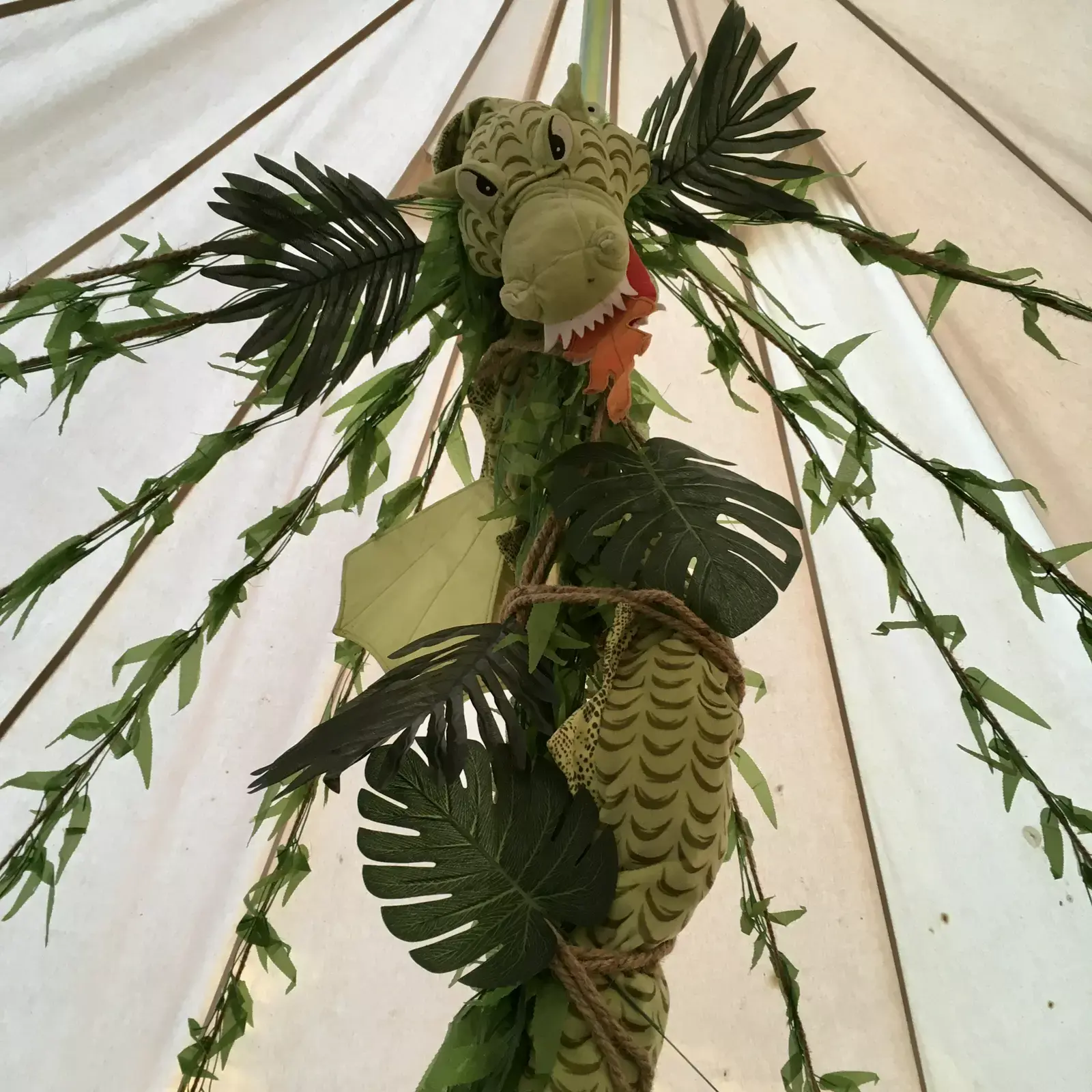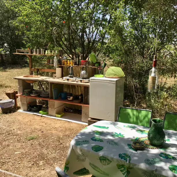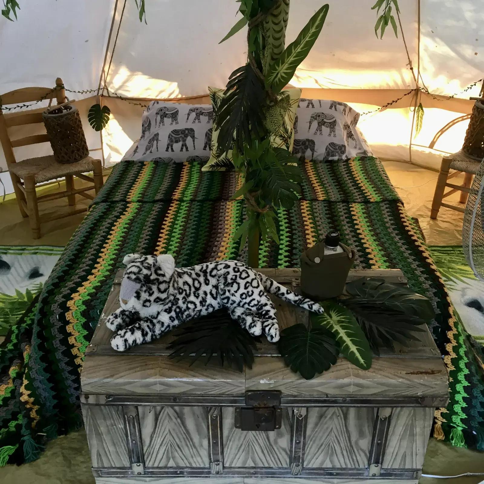 Sous un grand vieil olivier, niché dans un coin avec beaucoup d'intimité, vous trouverez notre tente Jungle. L'intérieur de la tente cloche d'un diamètre de 5 m est décoré de vignes, de feuilles tropicales et de nombreux animaux sauvages (et câlins). Un lit king size est situé au milieu et jusqu'à deux lits simples peuvent être placés sur les côtés. Un ventilateur est prévu pour les nuits plus chaudes, la ventilation dans la tente est optimale grâce aux moustiquaires qui recouvrent toutes les fenêtres et portes et aux ouvertures de ventilation dans le haut de la tente qui laissent s'échapper facilement l'air chaud du jour. À l'extérieur de la tente, vous trouverez la cuisine extérieure entièrement équipée avec de l'eau courante, un réfrigérateur et 2 plaques de cuisson au gaz. A côté de la cuisine se trouve une grande table avec quatre chaises pour profiter des repas que vous préparez. Entre 2 oliviers, il y a un hamac et derrière la tente se trouve un coin salon caché. Les salles de bains communes sont à proximité.