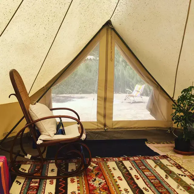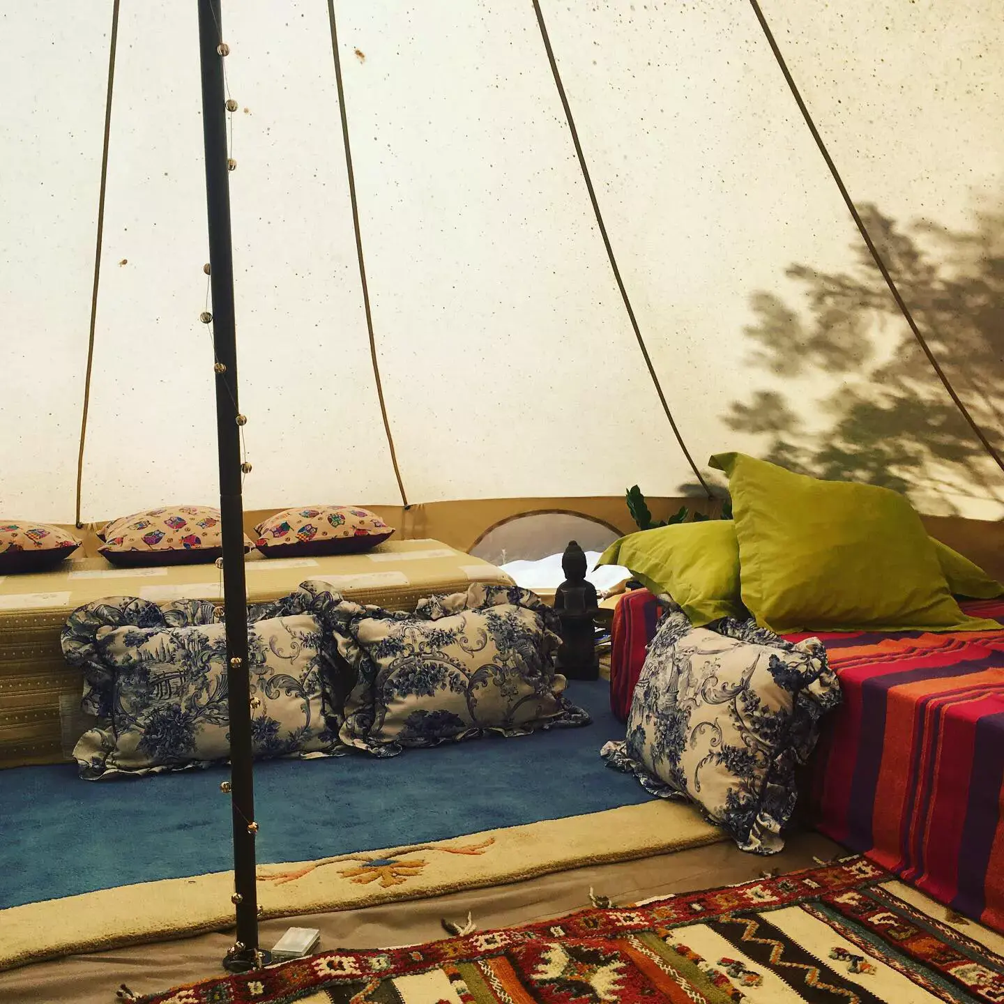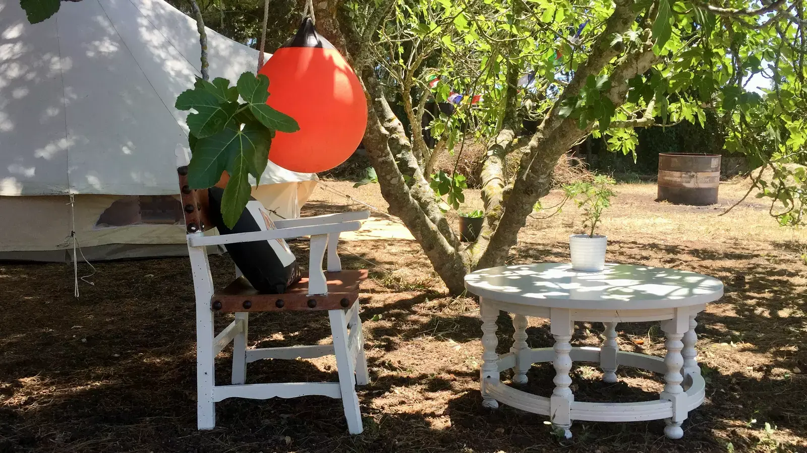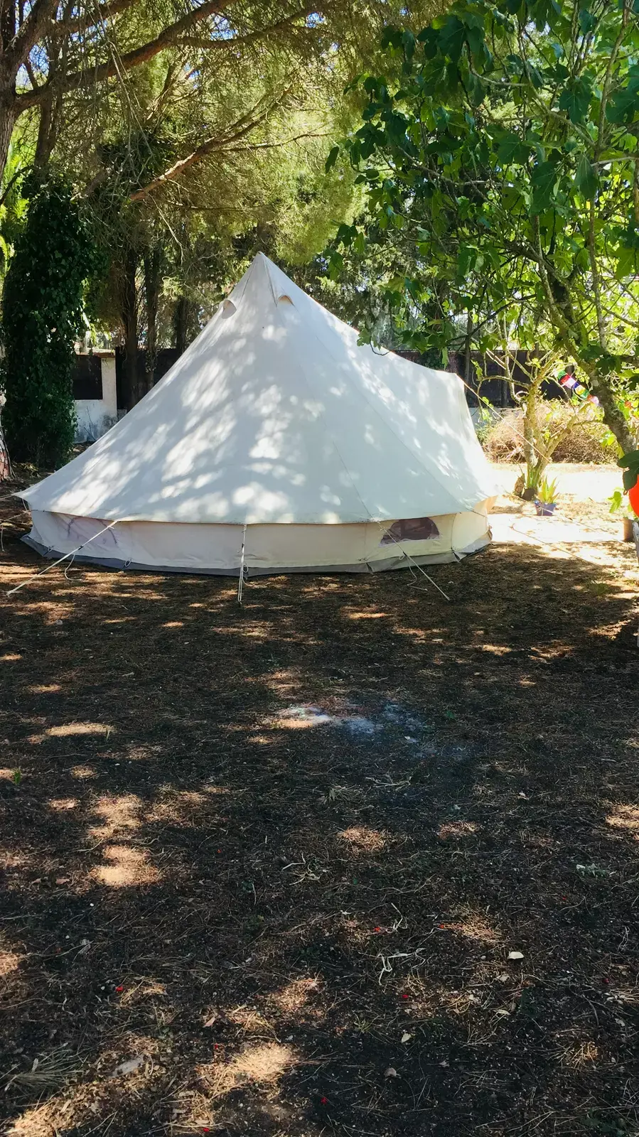 Cette tente Bell de 20m2 peut accueillir 3 personnes dans des lits simples. À l'extérieur, il y a des hamacs, des chaises longues et des tables de pique-nique ainsi que d'autres coins ombragés pour votre repos. La ferme propose également une roulotte jusqu'à 2 personnes et une maison pour 6 personnes.