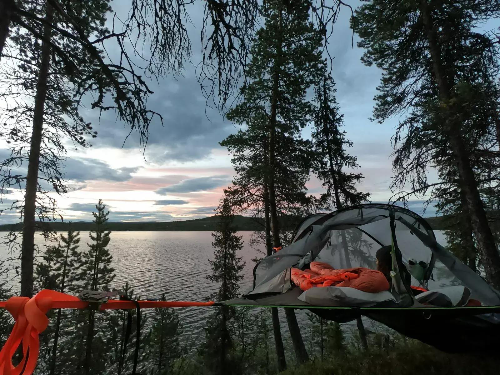 Nos deux tentes dans les arbres sont situées près de la rivière Torne dans notre camp, dans la forêt fantastique. Evitez les sols humides et accidentés, créez des souvenirs inoubliables en dormant au milieu des arbres et sous le soleil de minuit. Vous entendrez les bruits de la forêt près de chez vous et découvrirez une façon unique de camper. Les tentes en bois sont situées sur une colline juste à côté de nos installations à Aurora Camp. Parfait pour vous qui voulez sentir la paix de la forêt alors que les commodités sont au coin de la rue. Cela inclut : Sac de couchage Literie Oreiller Des draps Accès à : Douche et toilettes communes Sauna Balades dans la nature Ponton de baignade Espace barbecue Ajout: Jacuzzi Des possibilités de location de canoë/kayak sont disponibles sur place La location de vélos VTT est réservée avant l'arrivée ici.