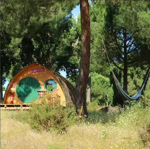 Dormir dans la Maison du Hobbit, c'est voyager dans le monde fantastique... Une cabane en bois avec une porte ronde, entourée d'arbres et d'animaux de la forêt, c'est comme entrer dans un livre de conte de fées plein de magie !