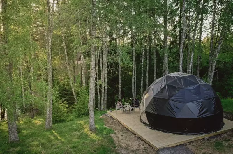 Alla tält har en king size-säng för 2 personer och extra bäddutrymme på en bäddsoffa som rymmer två barn eller en vuxen. Kupolerna inkluderar sängkläder och handdukar. Det finns eluttag, luftkonditionering och en dekorativ öppen spis i alla tält. Alla glampinggäster har tillgång till toalett och dusch, som ligger ett stenkast från tältet. Gästerna får serverat frukost under sin vistelse. Känner du för äventyr så finns Julareds höghöjdsbana och zipline precis i närheten, som gäst får du även fri tillgång till båten i lilla dammen och en plats för lägereld