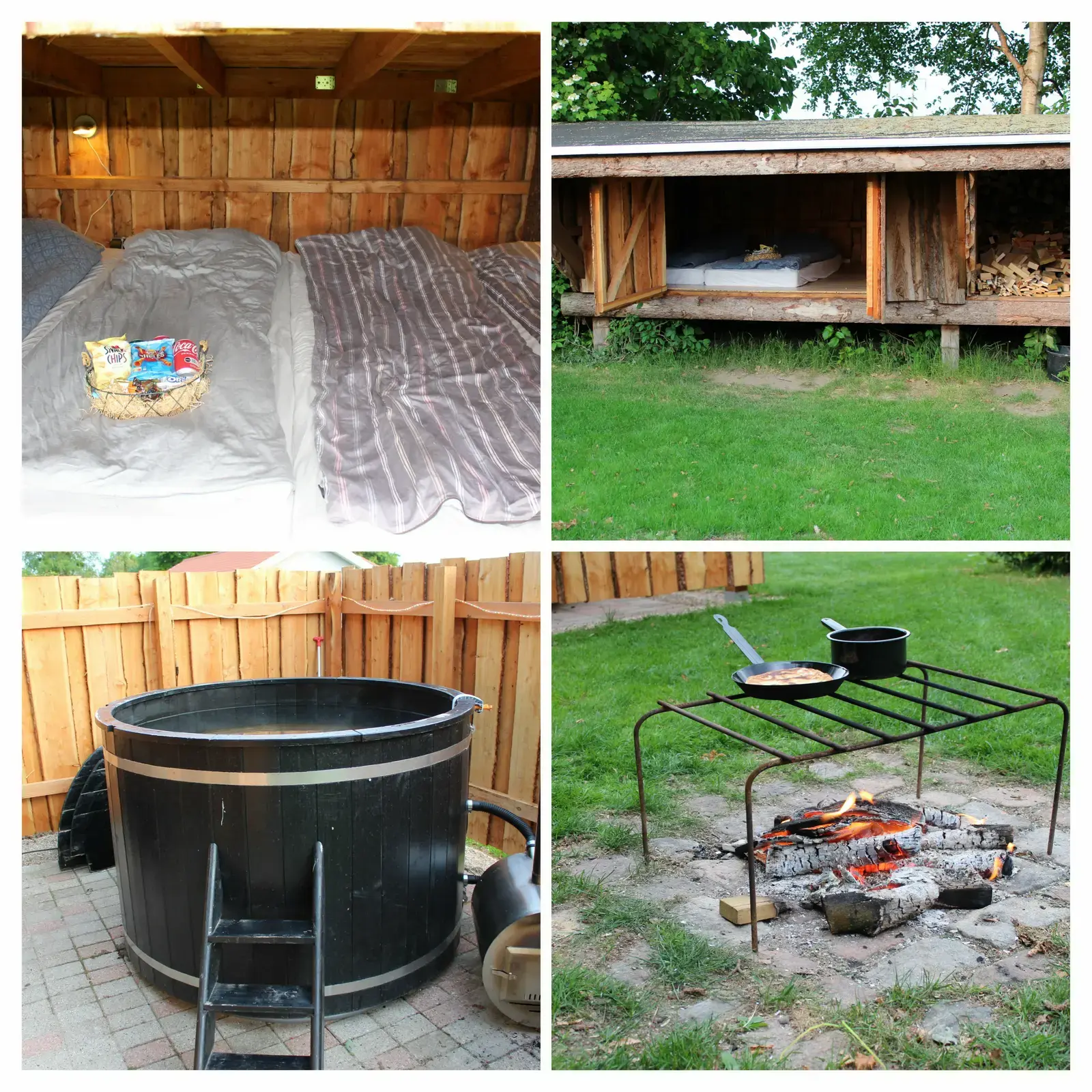 Perfetto per una pausa dalla vita quotidiana, dove la natura e la convivialità sono al centro dell'attenzione. I nostri rifugi di lusso sono dotati di elettricità, illuminazione e la possibilità di isolarsi completamente dal mondo esterno. Godetevi un falò, un barbecue e rilassatevi nell'arredamento da esterno. All'interno troverete un piccolo angolo cottura con macchina per caffè espresso, microonde e accesso ai servizi igienici. Potete portare la vostra cena, che può essere preparata sul fuoco (o all'interno in caso di maltempo). Sono disponibili attrezzature da cucina di base come una griglia, una bistecchiera, una piccola pentola, un tagliere e coltelli. Non vedete l'ora di immergervi nel caldo bagno nella natura selvaggia e di godervi una rinfrescante doccia all'aperto: un'esperienza di pace, benessere e presenza a cielo aperto.