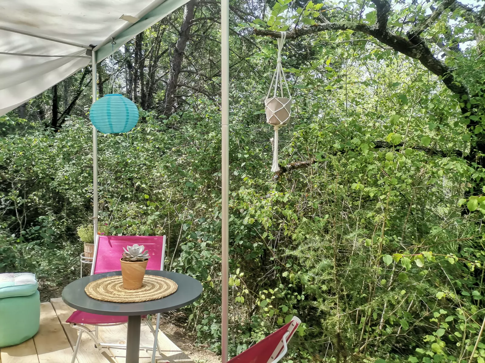 Le Mas des Pins est un domaine de 3 hectares de forêt, avec 6 hebergelents insolites dont une caravane Bohême avec petite terrasse et vue sur la forêt.
