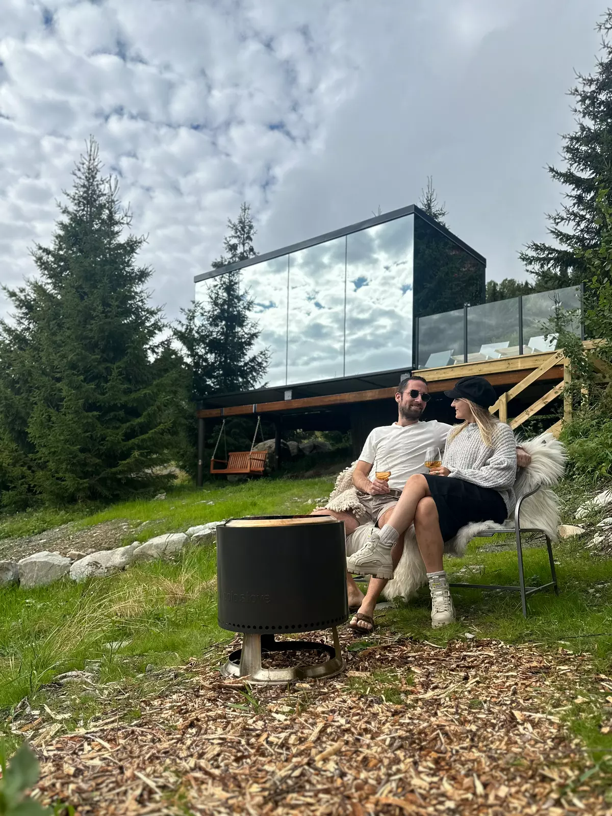 - Speilfasade i naturen: Hytta reflekterer landskapet rundt, og den speilbelagte fasaden gjør at hytta smelter inn i omgivelsene.
