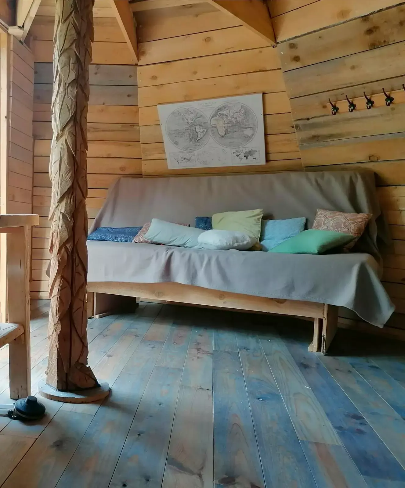 Hytte på bakken utstyrt med terrasse, tørrtoalett innvendig og oppvarming Elektrisitet kommer fra solcellepanel. Jeg anbefaler deg likevel å ta med ladet mobiltelefon og lommelykt. Hvis du bor tre netter, kan du dra nytte av den ekstra kokeplate og servise for å tilberede måltidene dine. Sengene er dekket med dyner og puter. Takk for at du tok med sengetøy og håndklær. Sengene mine måler 140 x 190 centimeter, sovesofaen har to senger på 70 x 200 centimeter (dvs. en dobbeltseng på 140 x 200 centimeter utfoldet) og to barn kan sove på loftet. Jeg er klar til å ønske deg velkommen fra kl. Vi tar farvel og sees snart før kl 11.