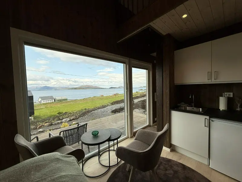At our farmstead, you can enjoy a comfortable stay in beautiful micro cabins with stunning views of the cultural landscape, mountains, and fjord.