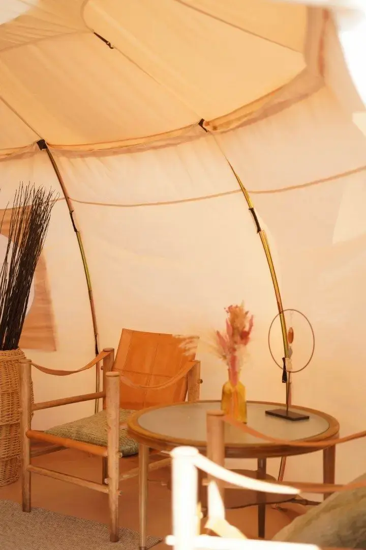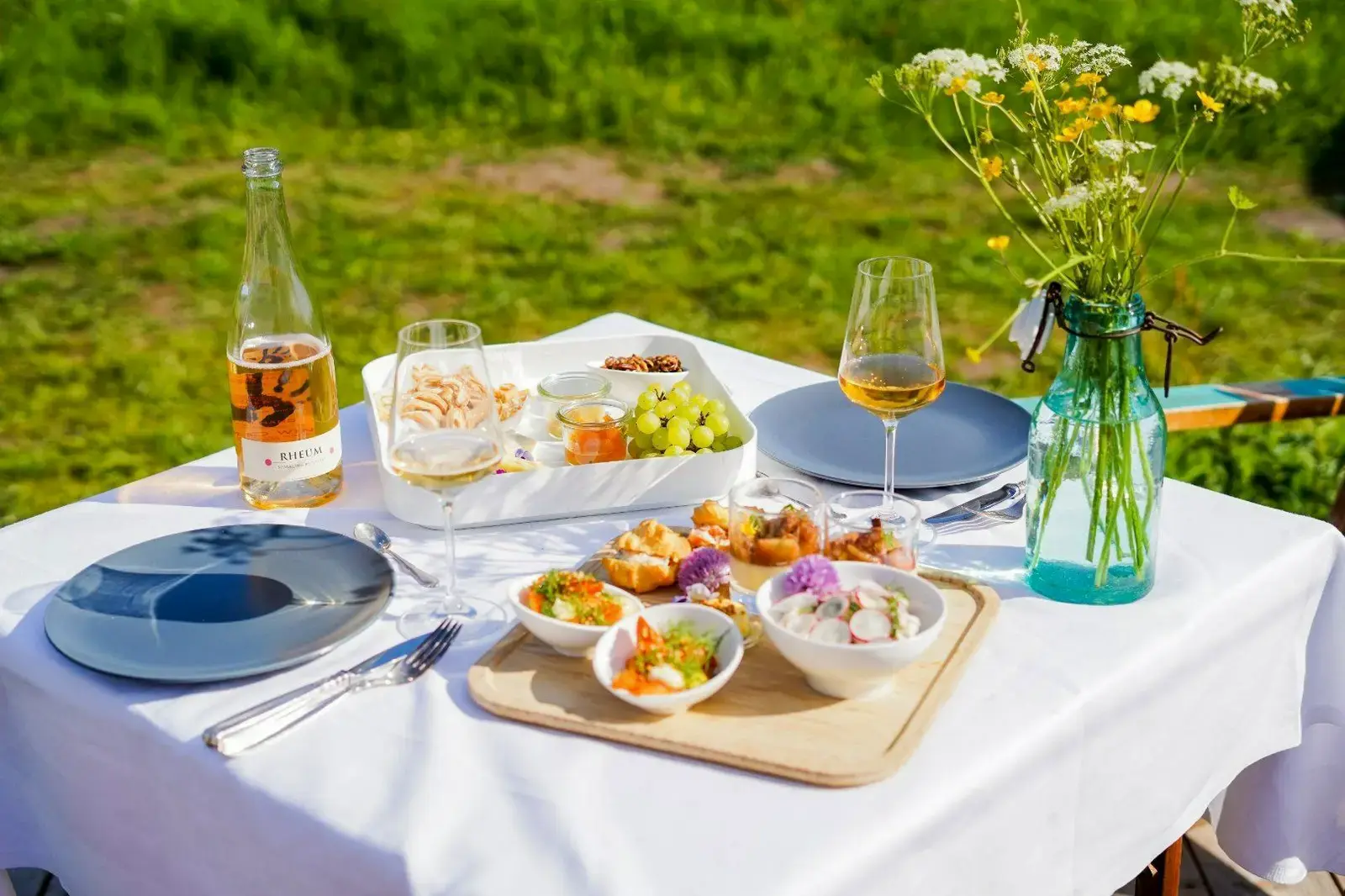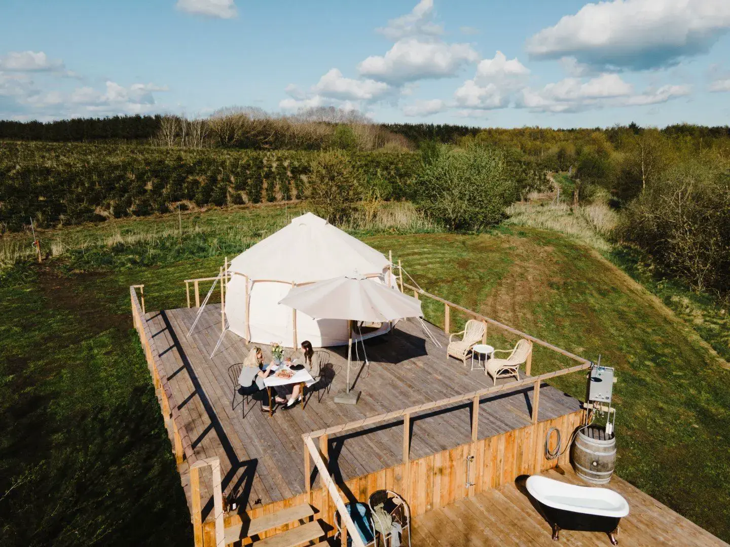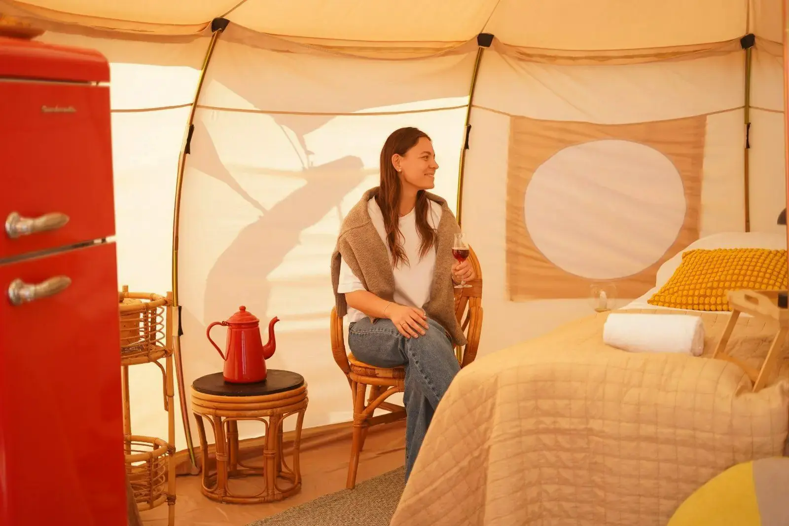 Romantisk glamping med naturen runt omkring. Camp Sunrise är ett romantiskt lyxtält utrustat med dubbelsäng, kylskåp, solstolar etc. Utomhus väntar ett badkar med lejontassar, utomhusdusch med varmt vatten och en eldstad med utrustning för att göra kaffe och te. Camp Sunrise ligger idylliskt och helt ostört med en fantastisk utsikt över vår högmosse. Faciliteter på Camp Sunrise Möjlighet att köpa vingårdens hemgjorda lunchlåda. (tapas för 2 personer) Möjlighet att köpa ytterligare tid i vingårdens Bath & Bubbles. - bokad och betalad på vingården Inkluderar en lätt, hemlagad frukost. Inkluderar tre utvalda viner från vingården. Bäddad dubbelsäng med två täcken och kuddar. Två utomhusloungestolar. Kyl/frys med vatten, äppeljuice och lätt frukost. Tallrikar, bestick, vattenglas, vinglas och karaff. Vattenkokare och tryckkokare. Kaffe, te, socker. Grammofon och gamla skivor. Hopfällbart bord, matstolar, duk. Utomhusdusch med varmt vatten, badkar, handdukar och tvål. Toaletter vid vingården och en liten naturtoalett vid lägret. Inklusive viner och lätt frukost En glampingvistelse inkluderar tre utvalda viner från vingården. Och när du vaknar på morgonen finns det kaffe, te och äppeljuice samt en lätt hemlagad frukost. Allt är klart på boendet Frukosten består av: Hembakat knäckebröd, 1 tallrik smör, ost, pålägg och sylt, 2 flaskor kallt vatten och 1 flaska ekologisk äppeljuice. Även kaffe, te, socker och mjölk. Vi älskar brasor Därför finns det en eldstad/eldskål vid alla boenden. På boendet finns även ved, huggkubbe och yxa – så alla har möjlighet att njuta av värmen från en sprakande eld. Ved och tändved är en självklarhet – det ska vara bekvämt. Guidad tur Rundvisning och berättelser på vingården varje dag kl. 10 som avslutas med möjlighet att handla i gårdsbutiken.