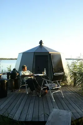 Lugn, natur och komfort: igloon är uppvärmd, har el, toalett, vatten, ett litet kök, en terrass med grill, och all el/uppvärmning kommer från solceller och bioenergi, så du kan njuta av din vistelse med gott samvete. Genom de stora panoramafönstren kan du följa ljuset över sjön från soluppgång till sen kväll eller ligga i sängen och titta på stjärnhimlen genom glastaket.